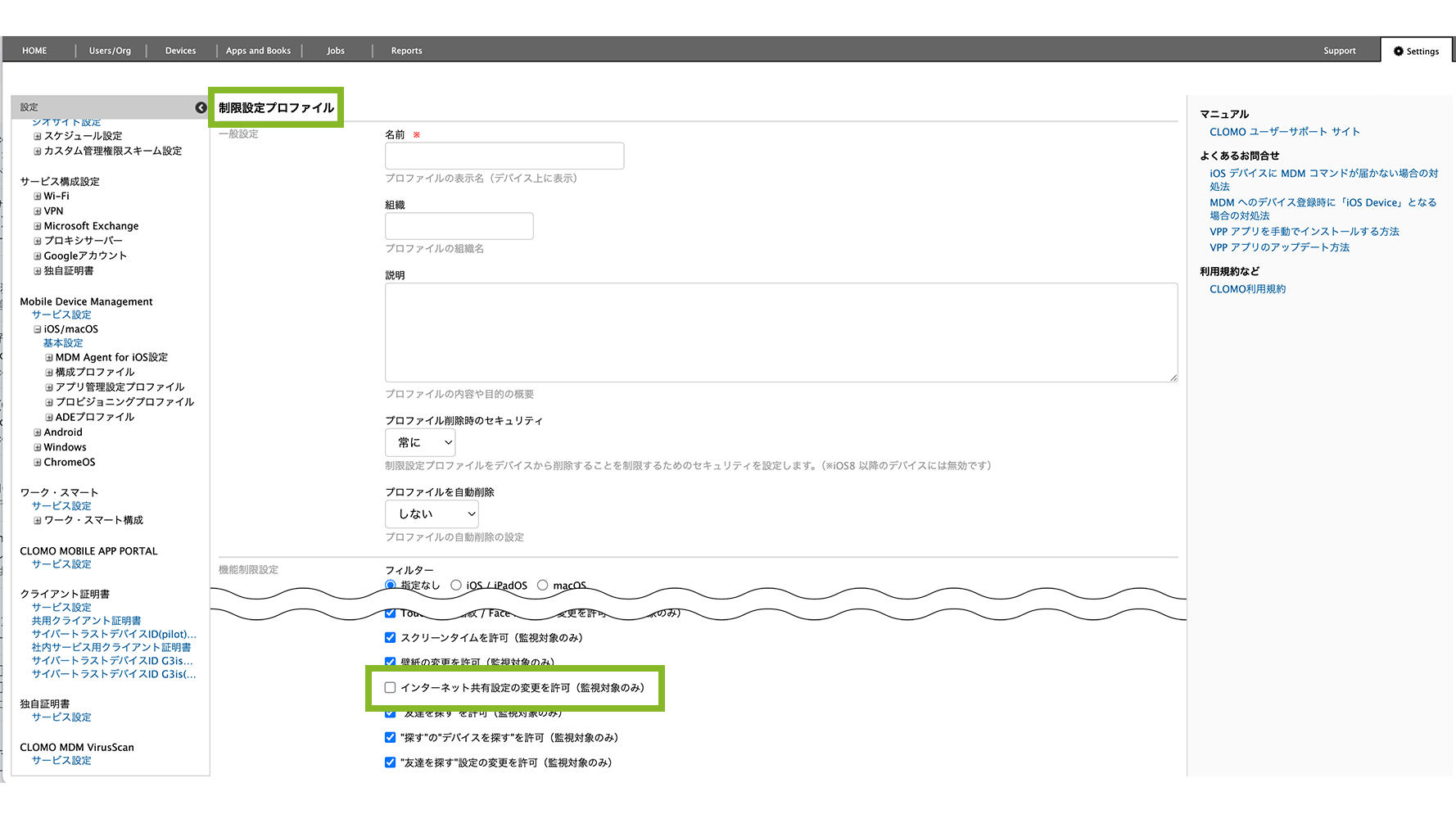 制限設定プロファイルを作成するをご参照ください。