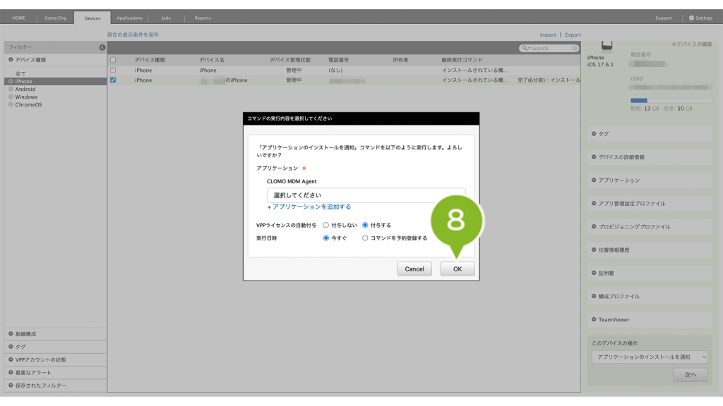 3. [ コマンドを選択してください ] から [ デバイスへインストールを通知する ] をクリックします。