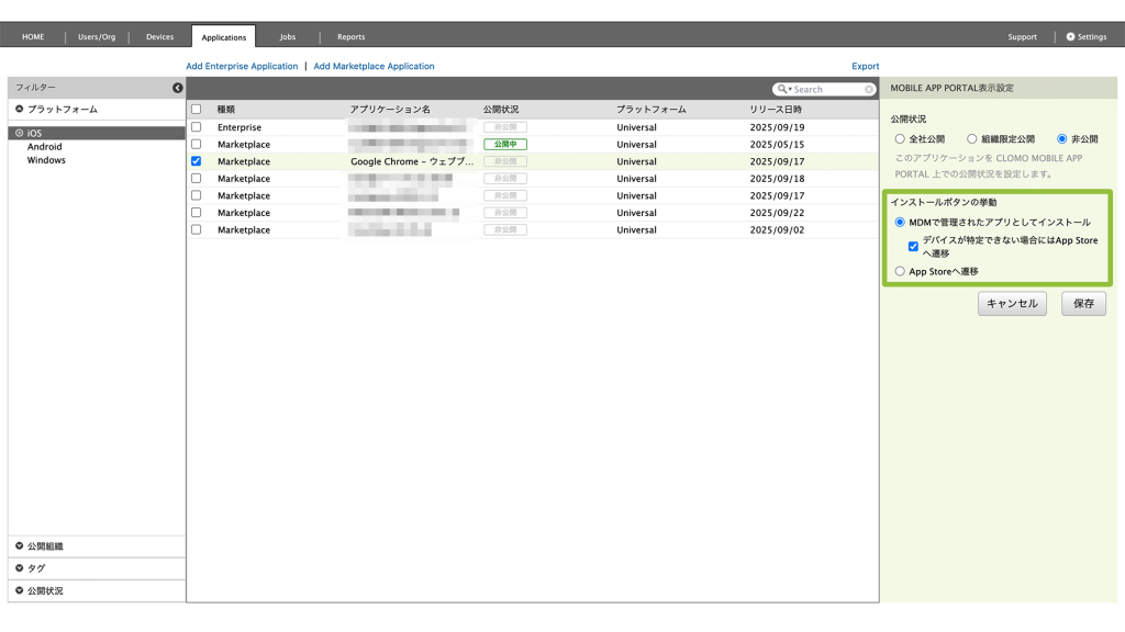 - CLOMO MDM Agent から、MOBILE APP PORTAL 経由でアプリケーションをインストールする