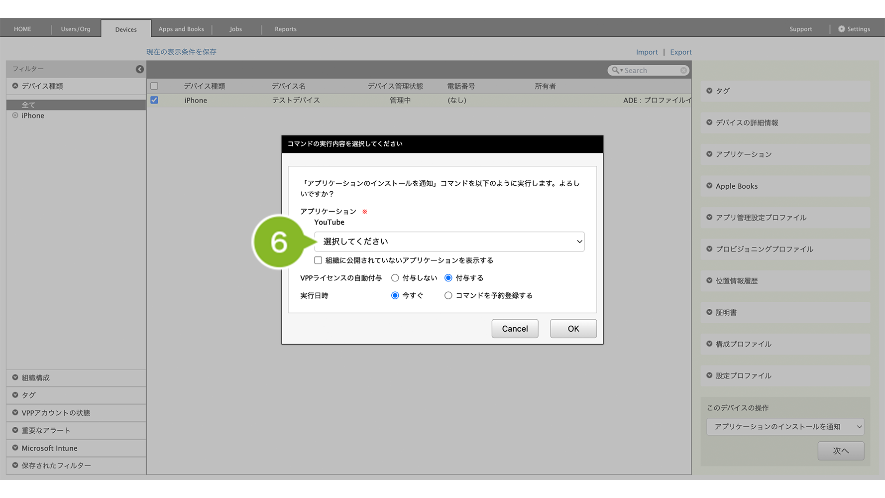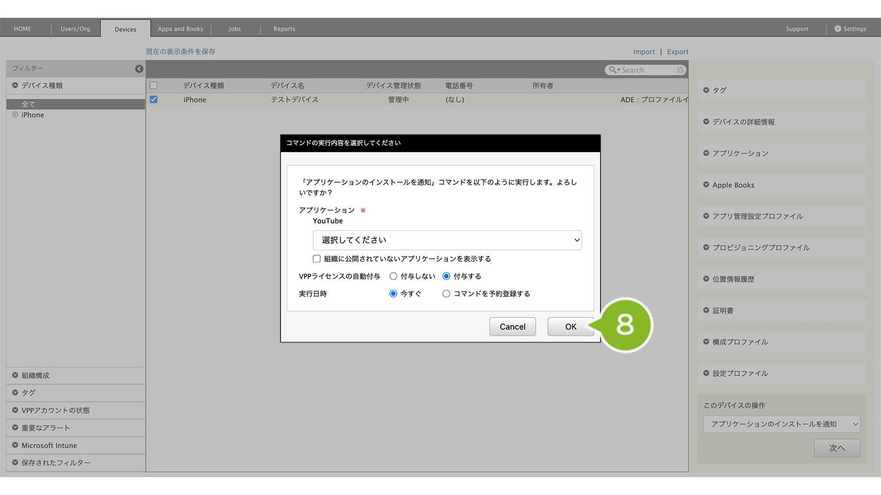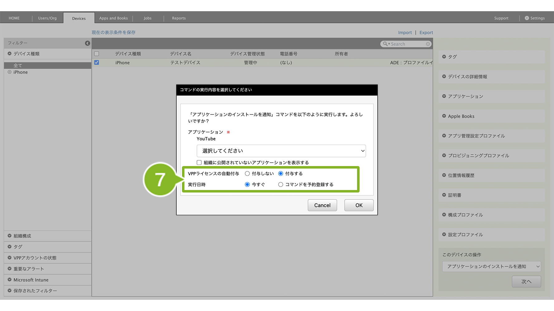 - 自動インストールを実行後、デバイスがオフライン等で7日間応答がない場合、自動インストールや VPP ライセンスの付与はおこなわれません。以下いずれかの方法で個別にインストールしてください。