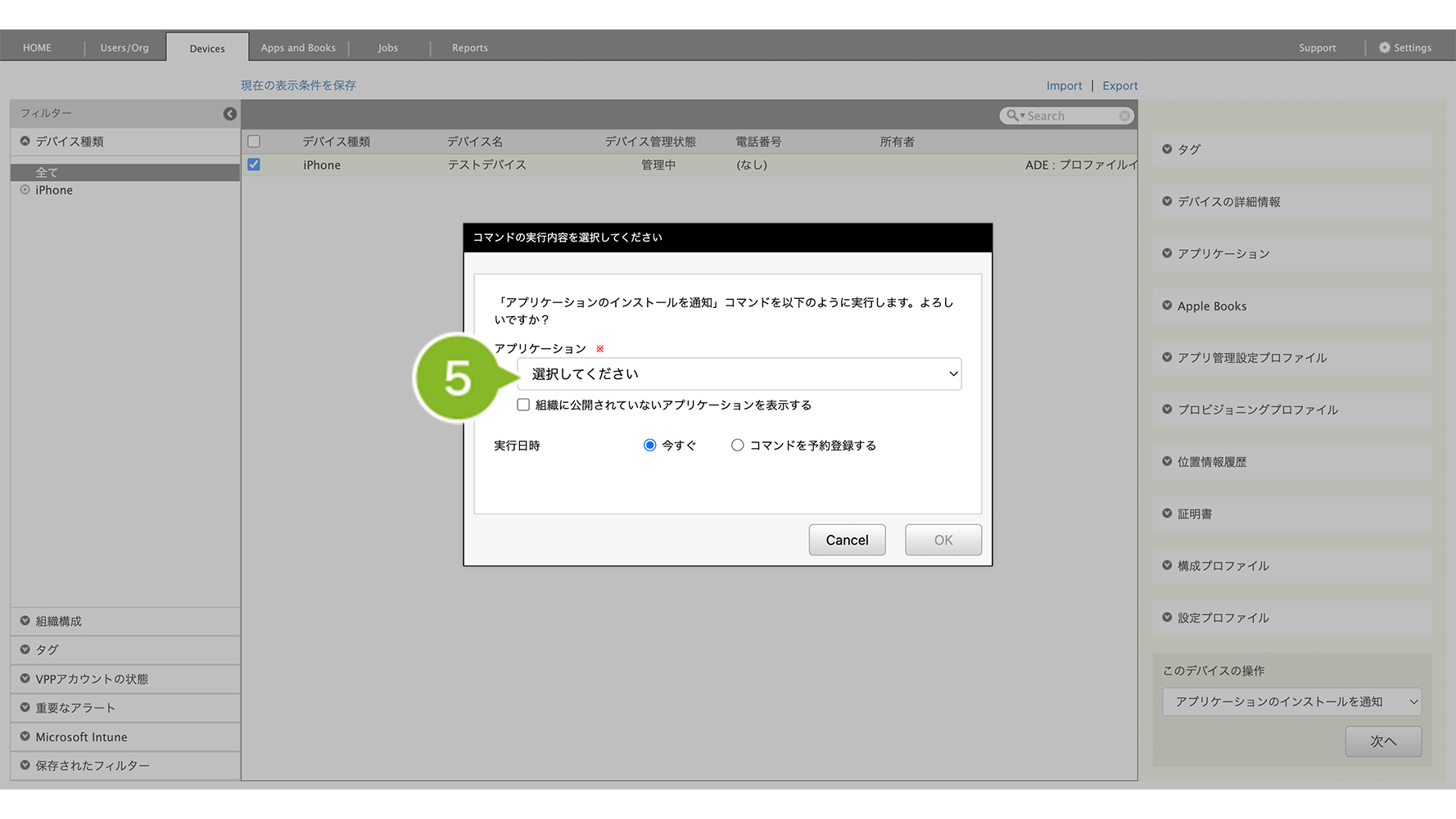 ※ アプリケーションごとでデバイスにインストール通知をおこなう場合は、「アプリケーションごとに実行」をご確認ください。