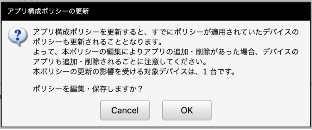 すでに同ポリシーが適用されているデバイスにも変更が反映されるため、アプリの「追加」や「削除」を行う場合、影響範囲を十分にご確認の上、操作を行ってください。