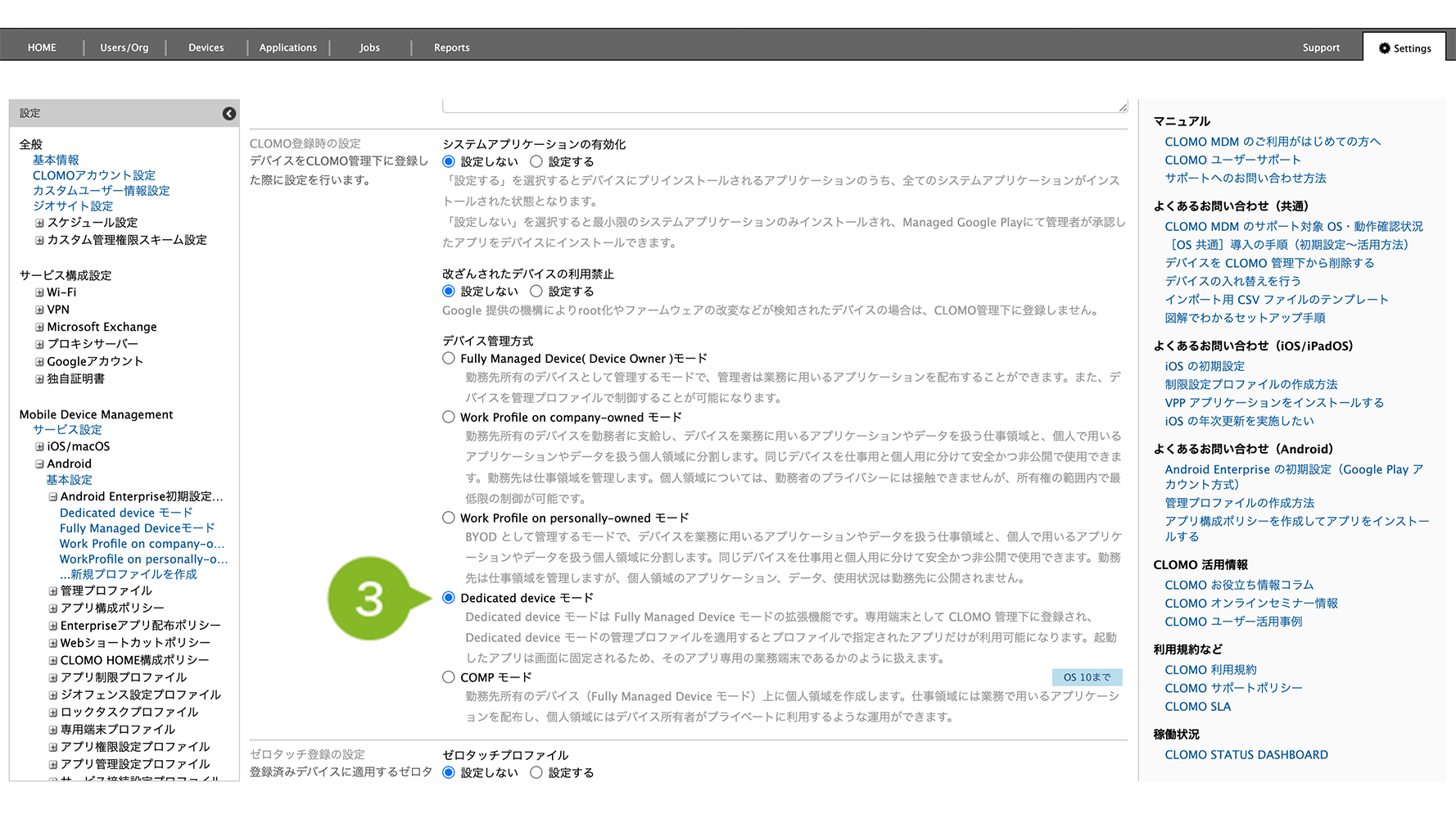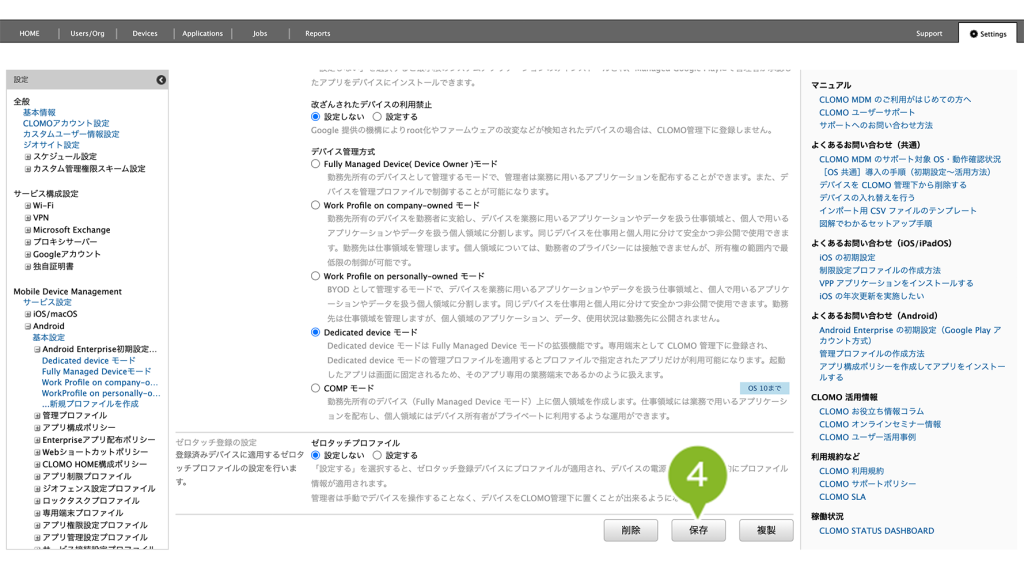 4. 画面左の一覧から「Mobile Device Management」→「Android」→「基本設定」と選択します。