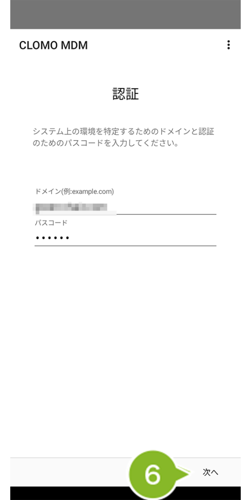 6. 認証画面が表示されます。ドメインとパスコードが入力されていることを確認して「次へ」を選択します。