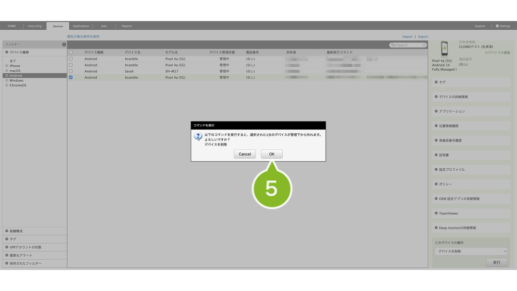 ※ 管理下から削除したデバイスに対しては、コマンドを実行できません。CLOMO で適用した制限を解除したい場合は、削除前にご対応ください。