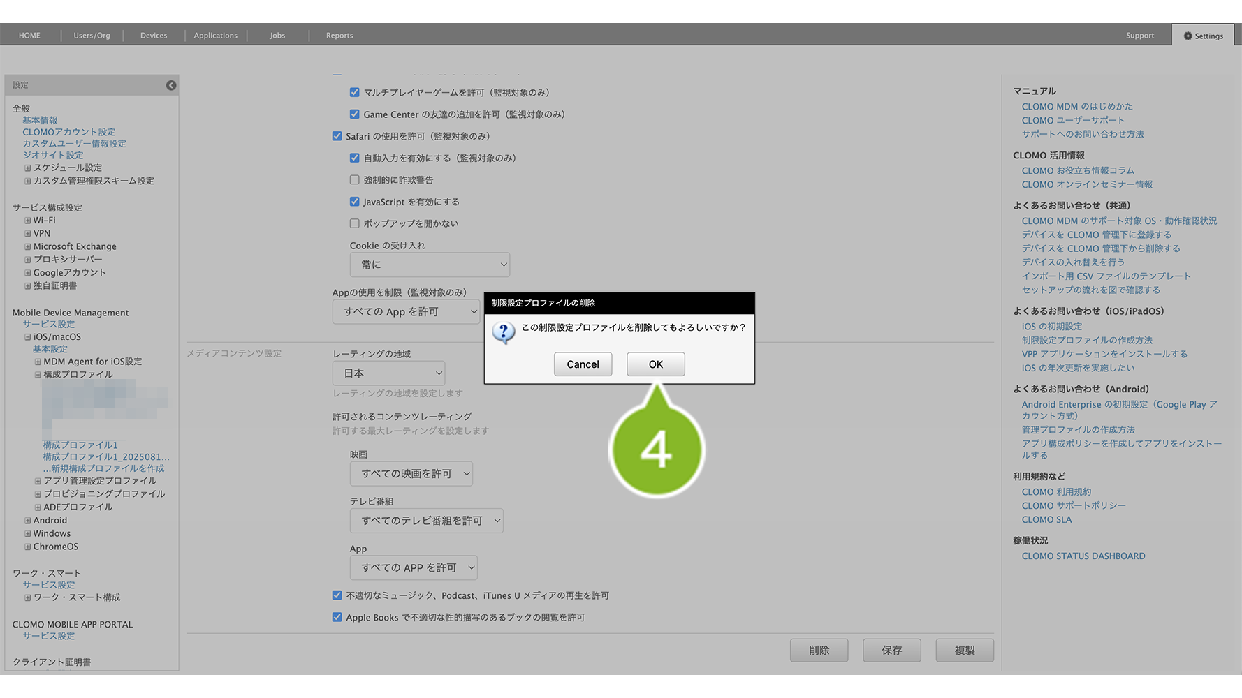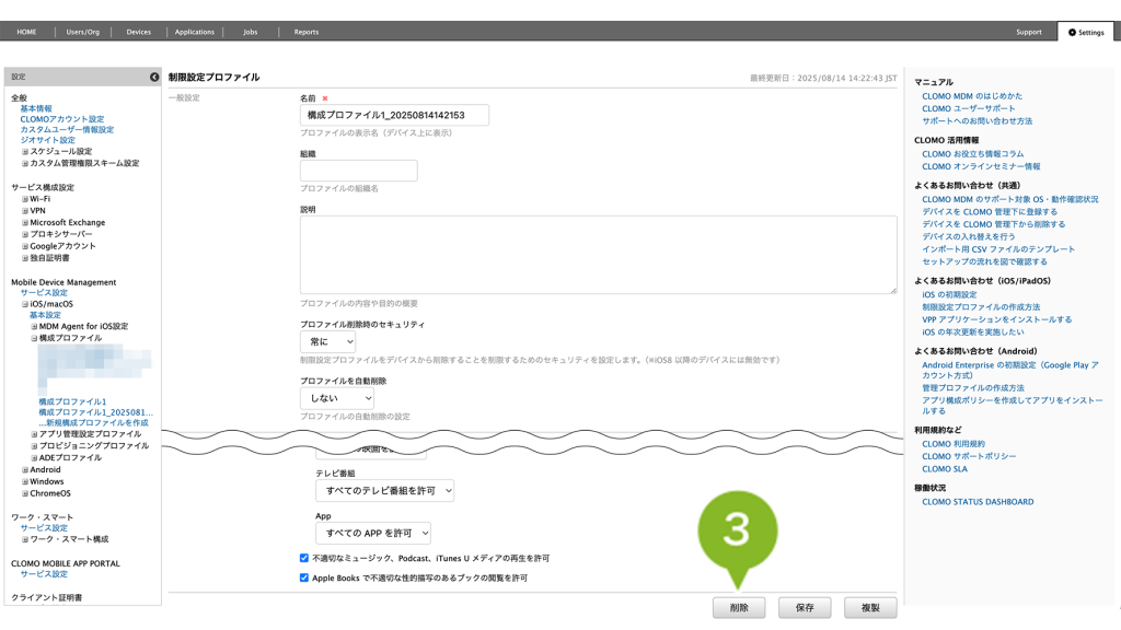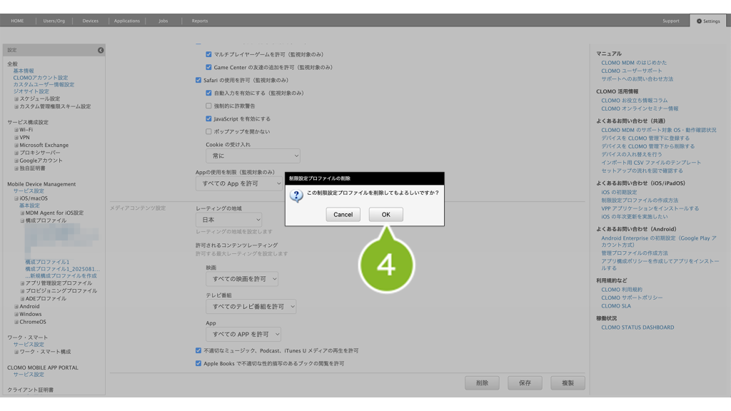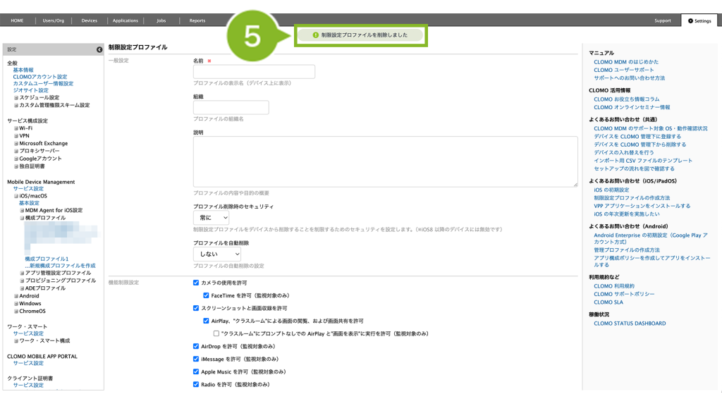 1. 制限を一時的に解除したいデバイスから、1-1の手順5で選択した、複製前のプロファイルをアンインストールします。