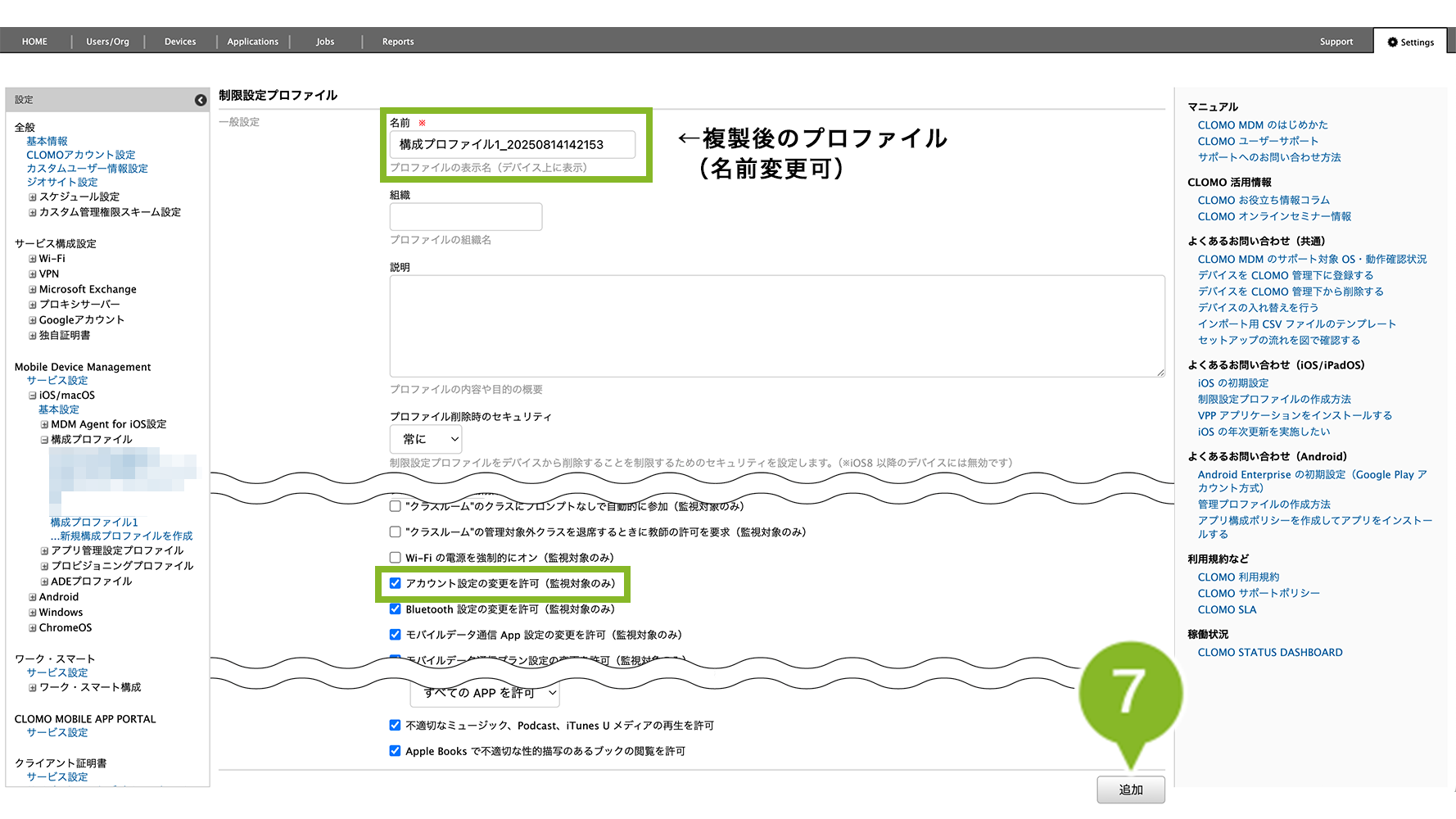 複製したプロファイルをデバイスにインストールして、元々適用していたプロファイルをデバイスからアンインストールすることで、制限を一時的に変更できます。