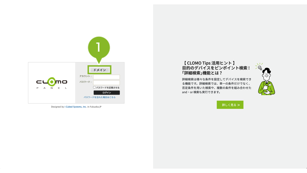1. CLOMO PANEL のログイン画面を開いて、ドメインを確認します。