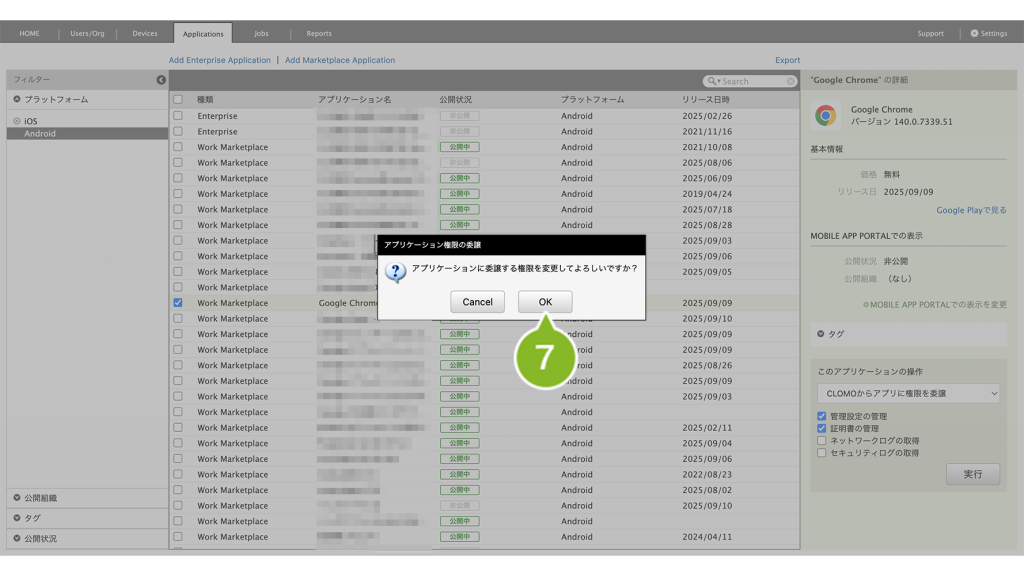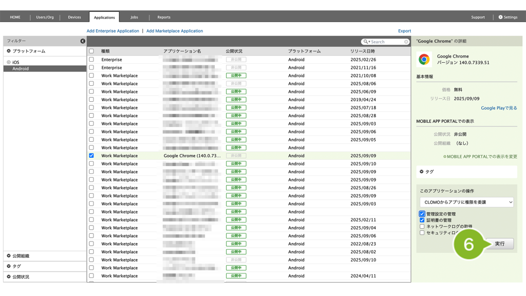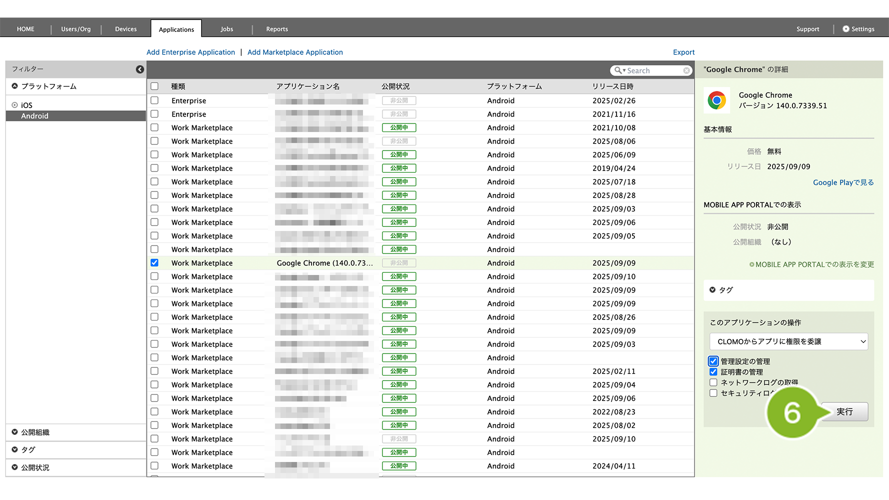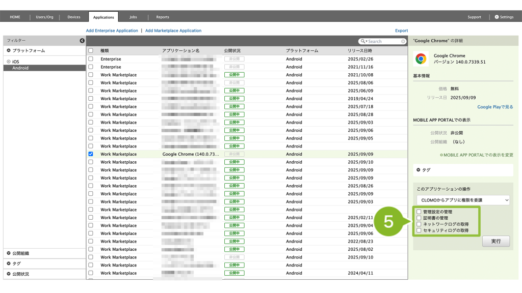 4. 「このアプリケーションの操作」から[CLOMO からアプリに権限委譲]を選択します。