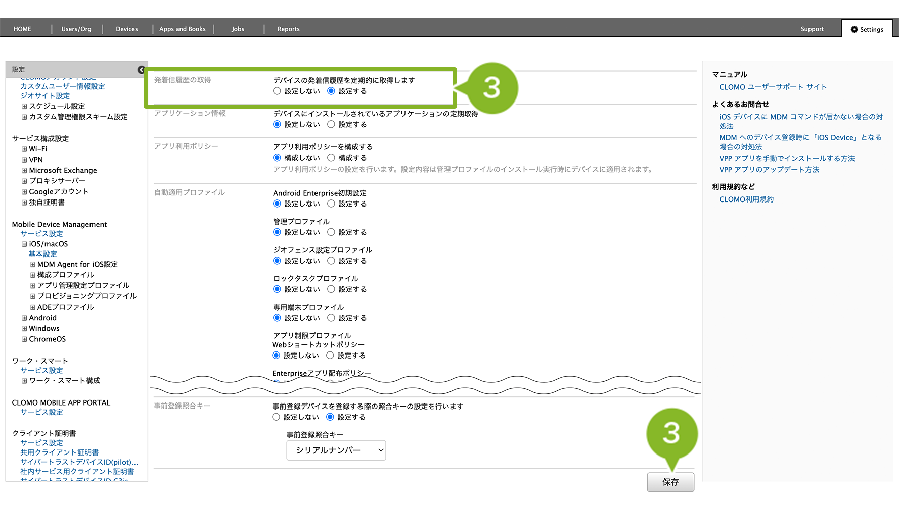 3. 発着信履歴の取得の「デバイスの発着信履歴を定期的に取得します」を「設定する」を選択し、[保存]をクリックします。