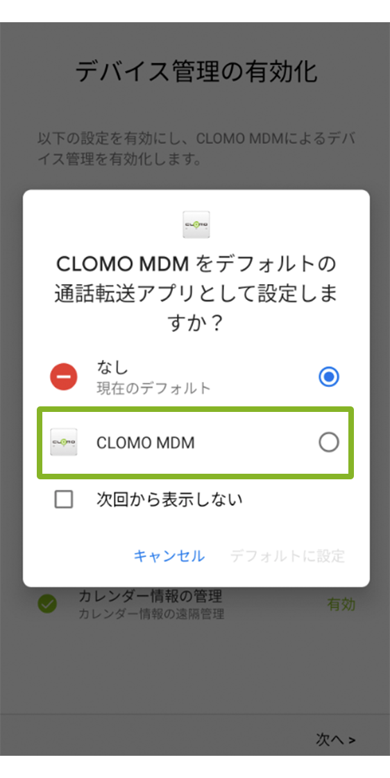- 設定アプリ > アプリと通知 > デフォルトのアプリ(標準のアプリ)> 通話転送アプリ にて CLOMO MDM を指定を選択