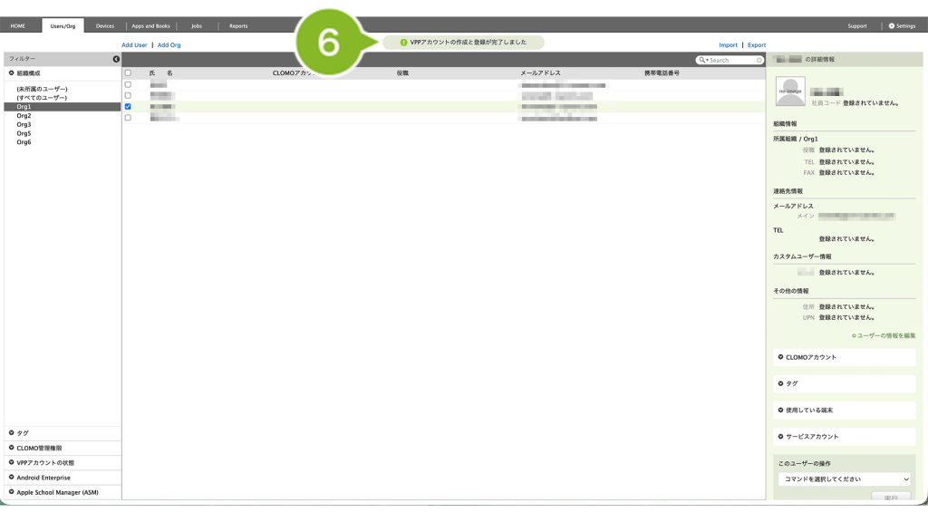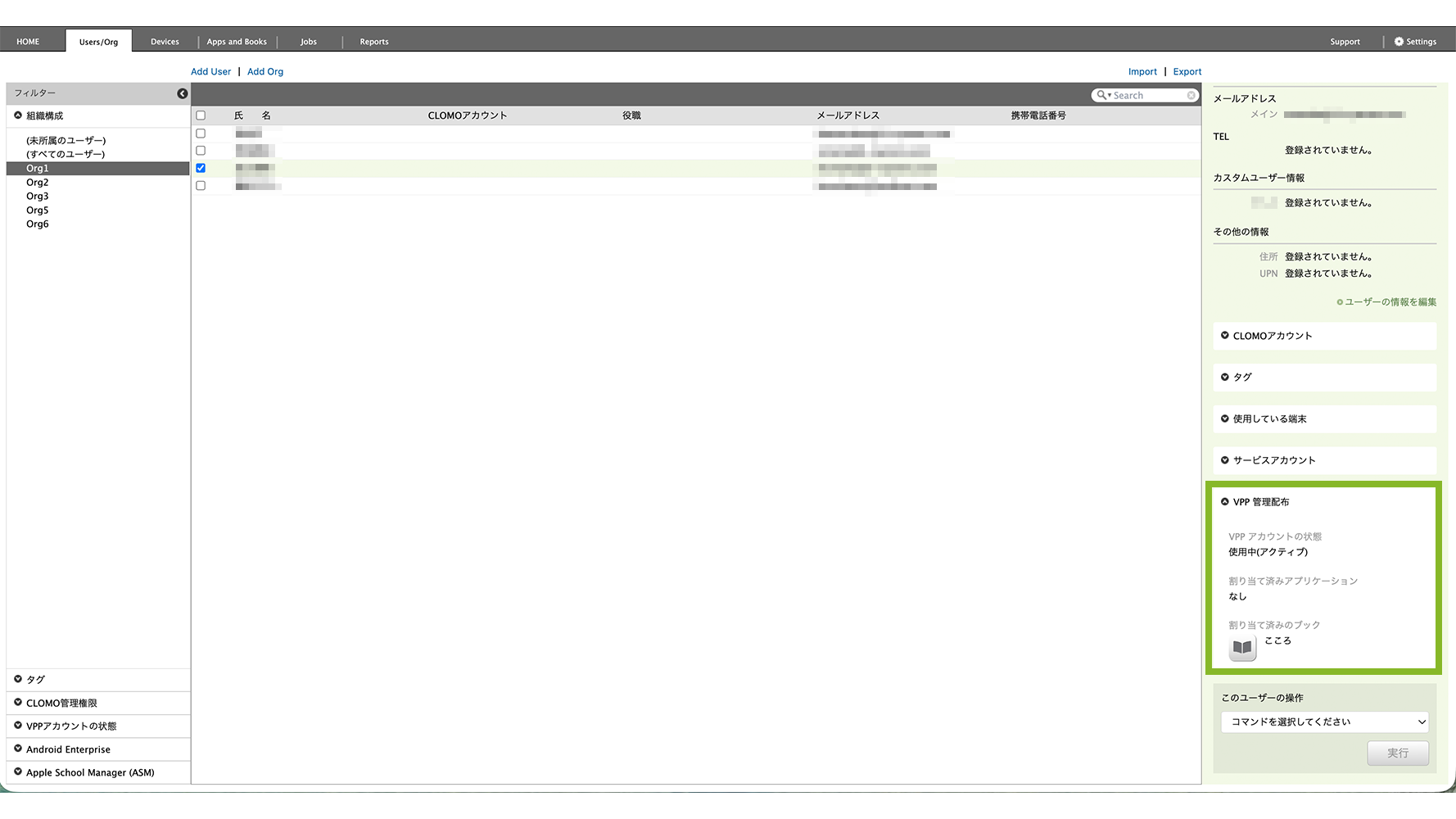 12. ユーザーを再選択して、[コマンドを選択してください]から[VPP アカウントの状態取得]をクリックします。