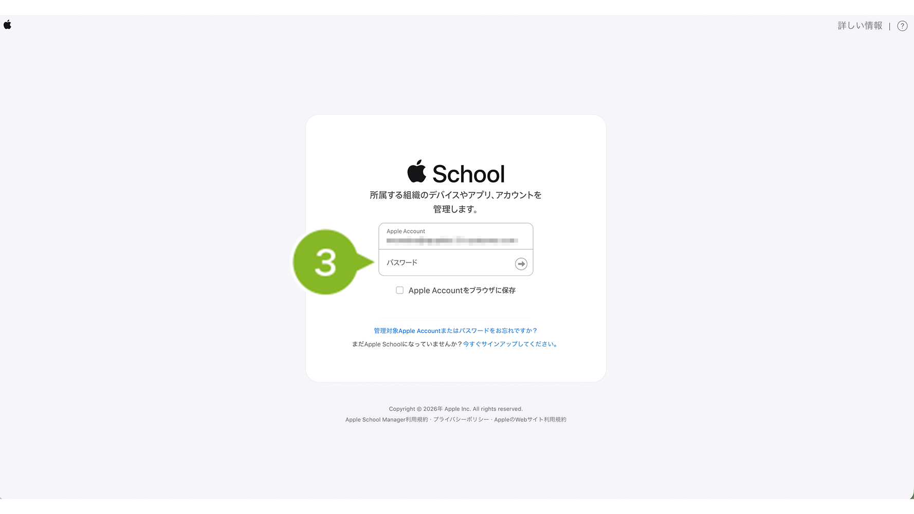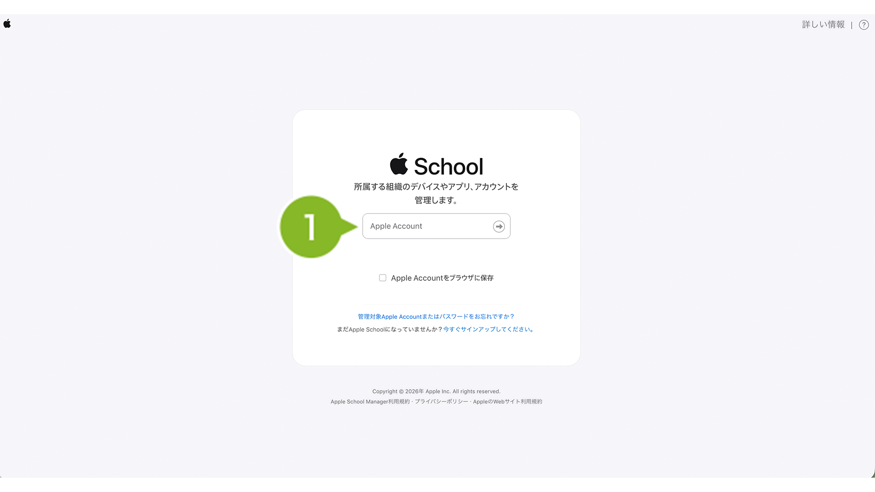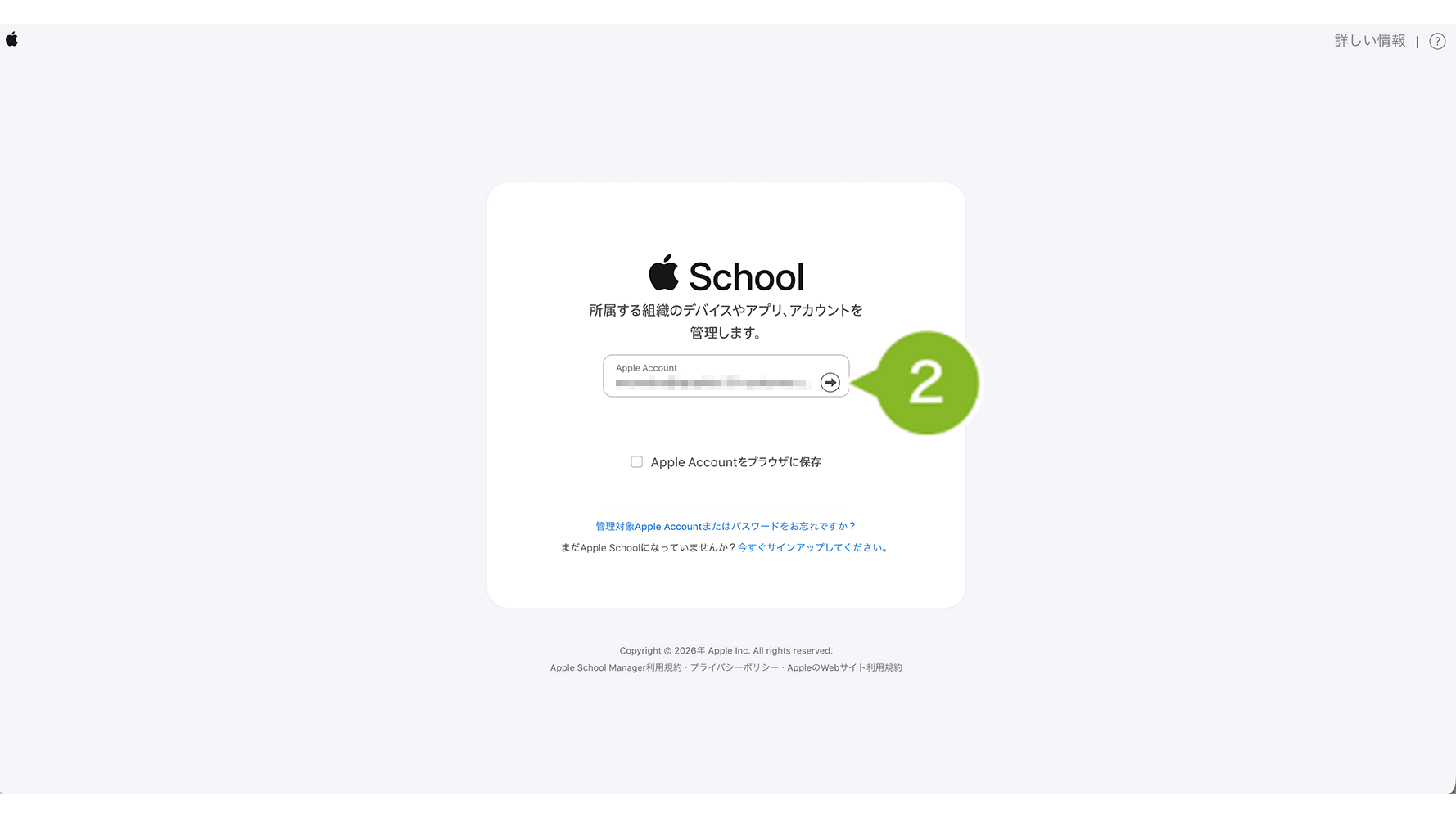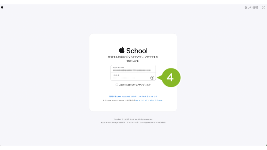 1. Apple Business Manager(https://business.apple.com)/ Apple School Manager(https://school.apple.com) へアクセスします。「管理者権限」もしくは「コンテンツマネージャ権限」をもつ管理対象 Apple Account を入力します。