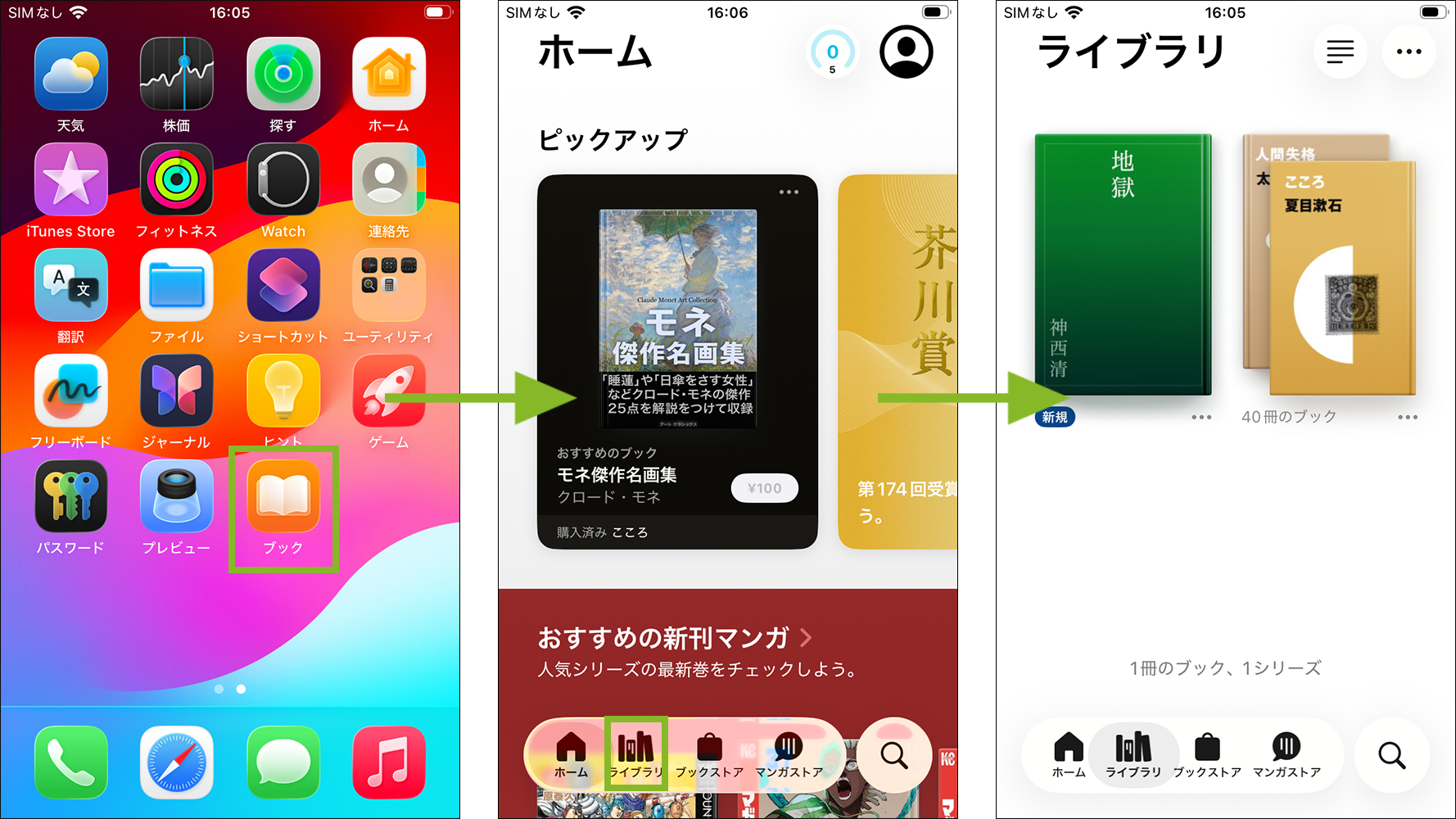 8. デバイスの「ブック」アプリを起動すると、「ライブラリ」にインストールしたブックが表示されます。