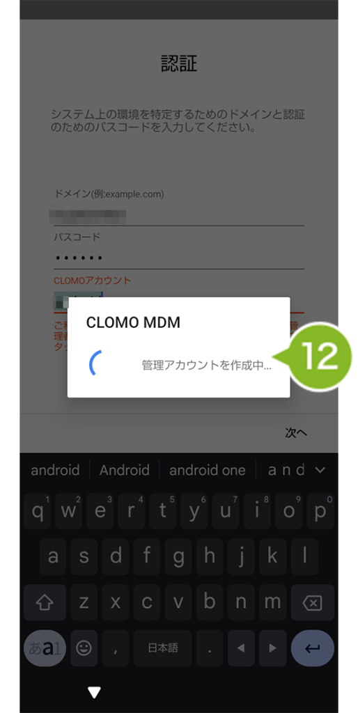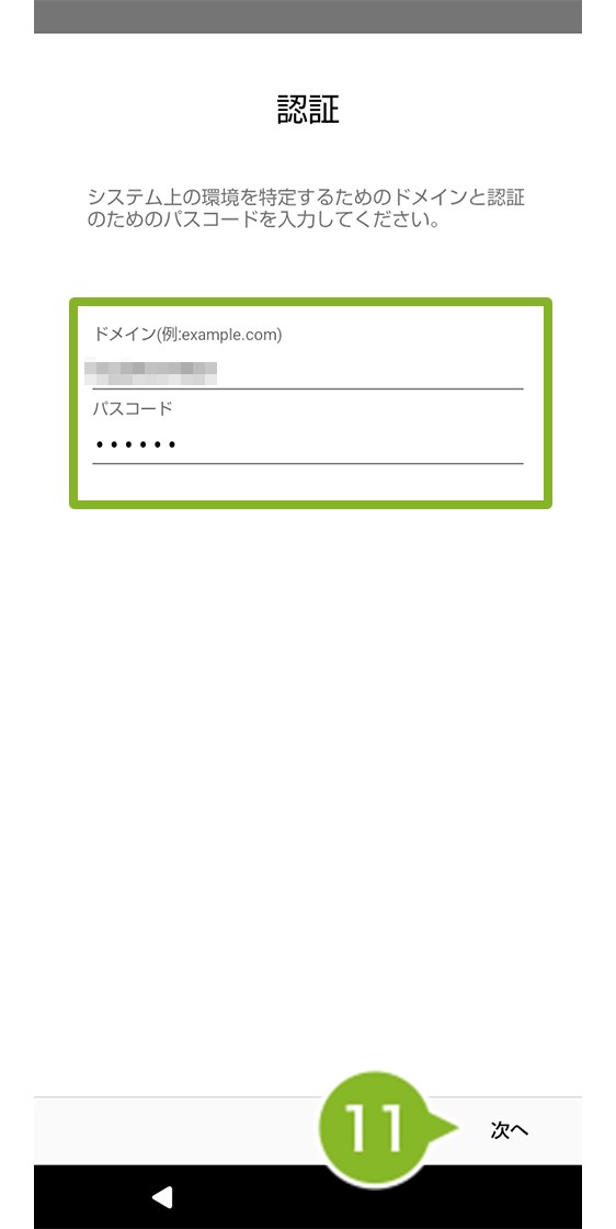 11. ドメインとパスコードを入力し、[次へ]をタップします。