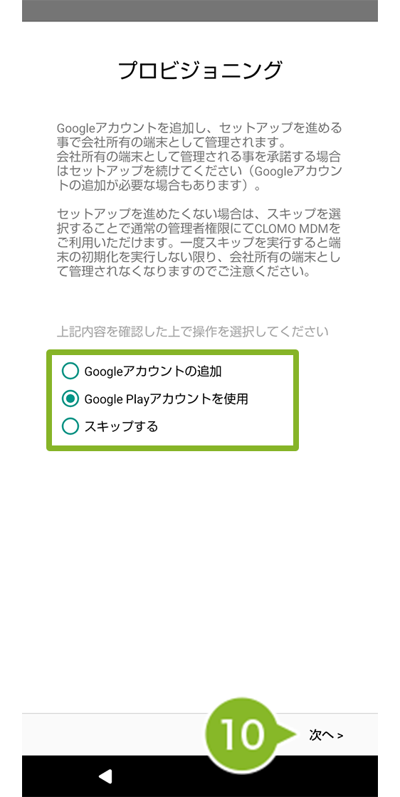 10. プロビジョニングモードで[Google Play アカウントを使用]が選択されていることを確認し、[次へ]をタップします。