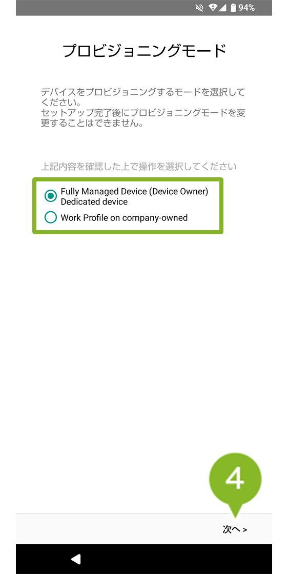 4. プロビジョニングモードを選択し、[次へ]をタップします。