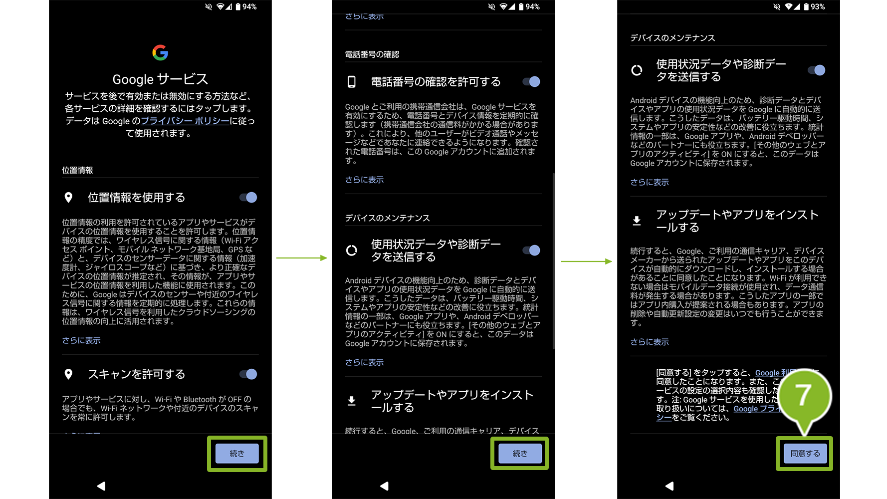 7. Google サービスのプライバシーポリシー画面が表示されたら[続き]をタップしていき、[同意する]をタップします。