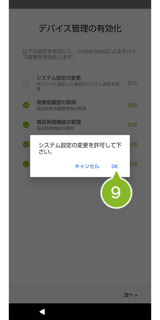 9. システム設定の変更許可画面が表示されたら[OK]をタップします。