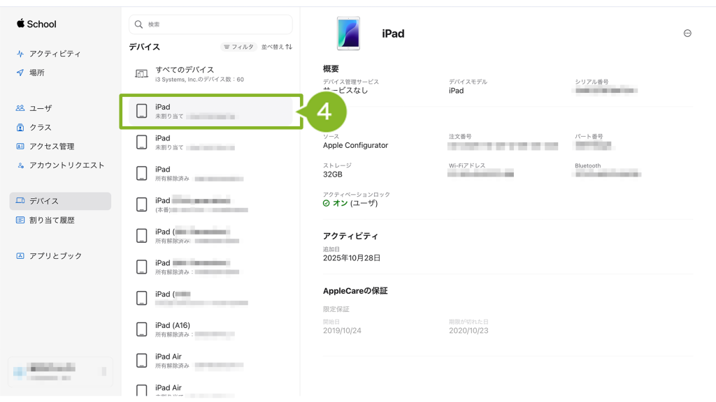 デバイスに所有者情報を追加し、組織情報を設定することで学年ごとや科目ごとにデバイスを細かく管理することができます。