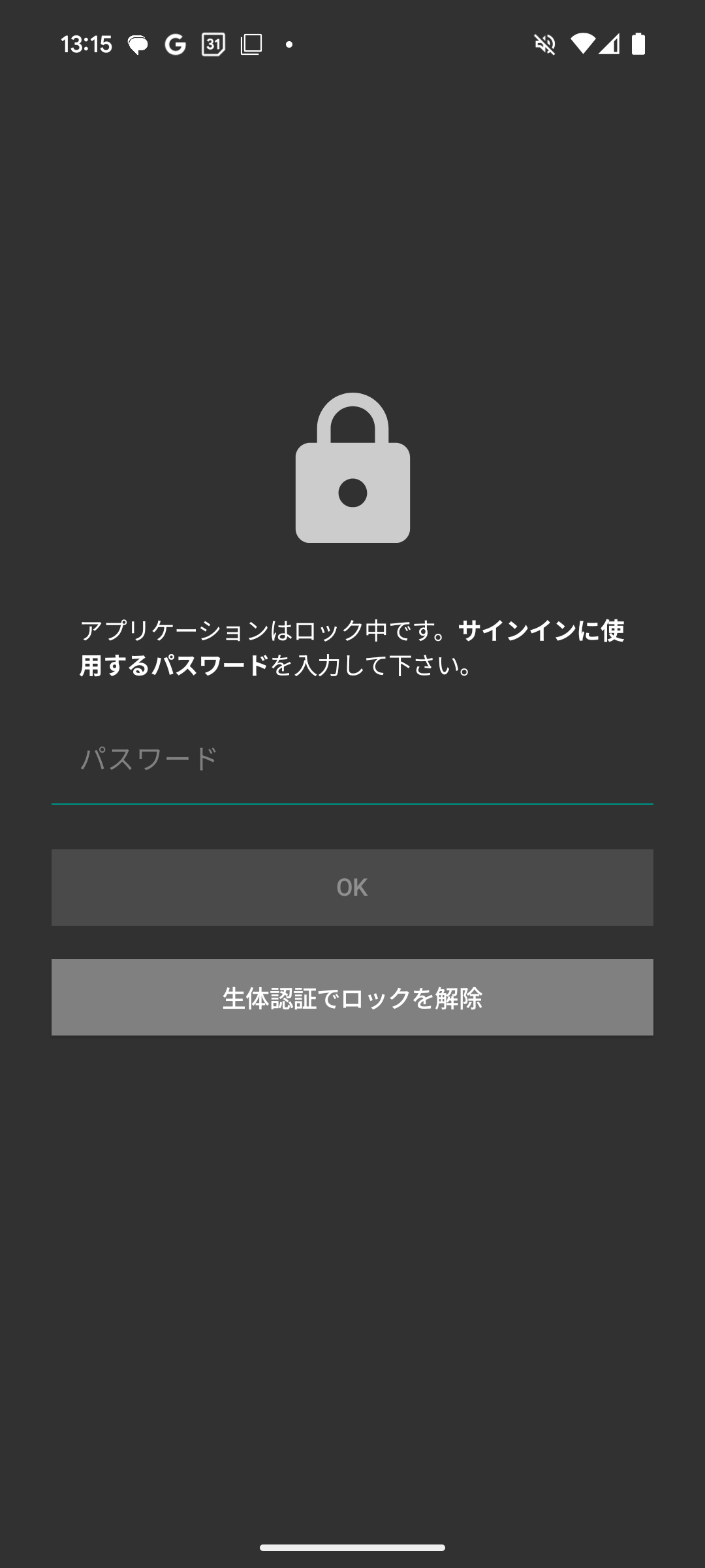 1. パスワードを入力し、「OK」を選択することで、ロックを解除できます。