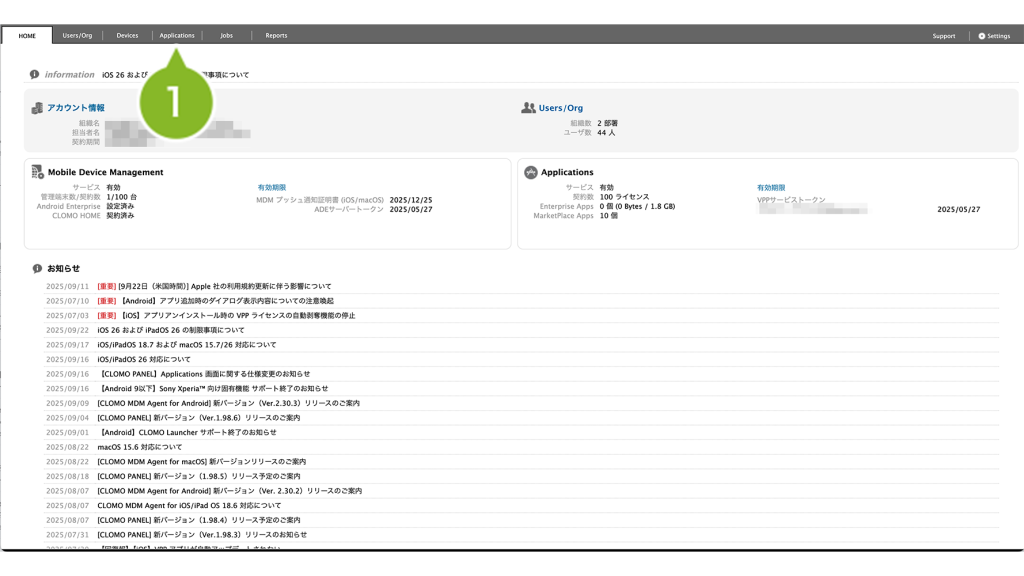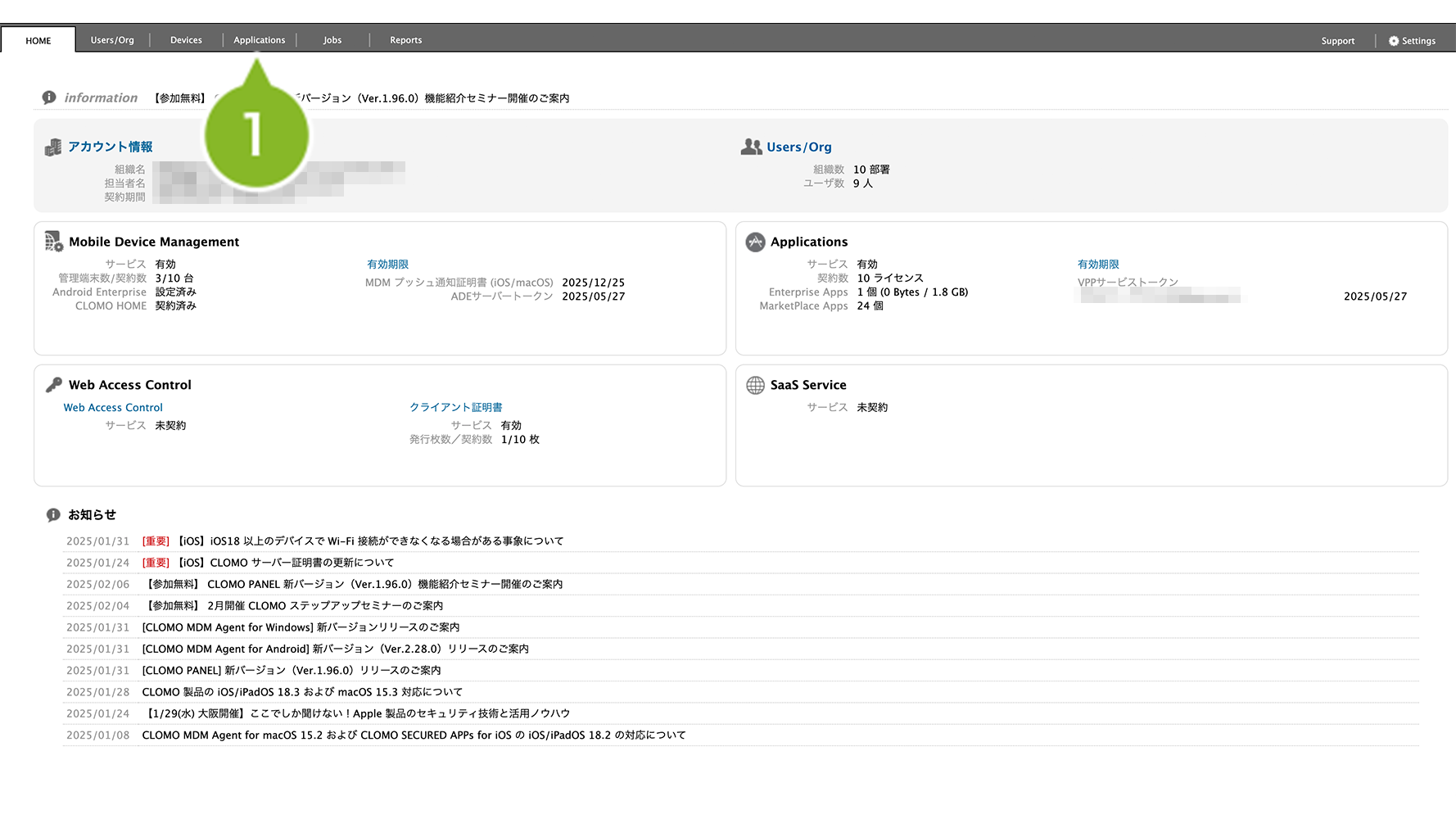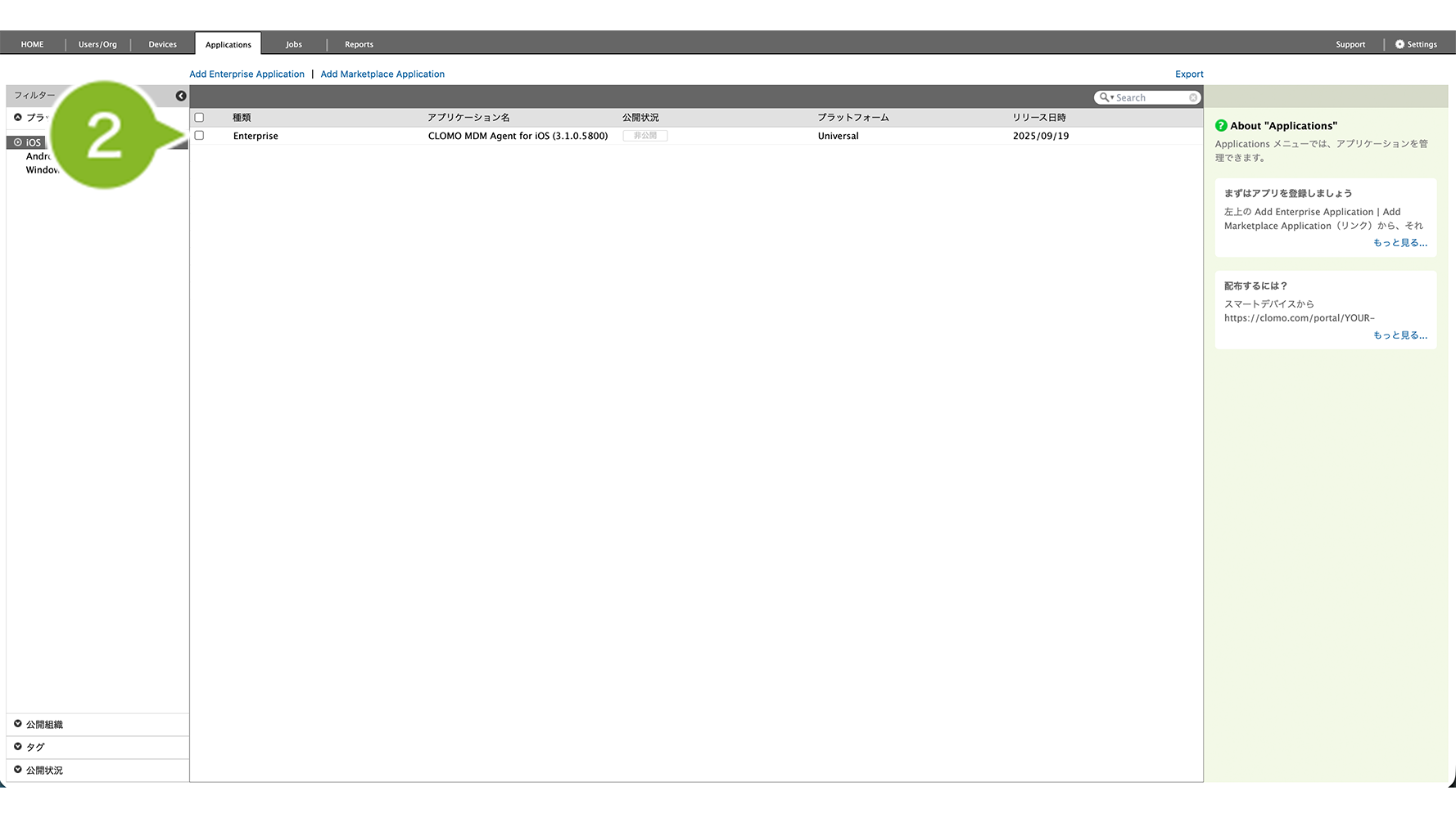 1. CLOMO PANEL にログイン後、[Applications]をクリックします。