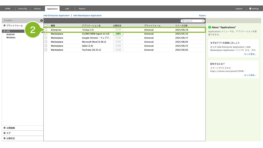 社内アプリケーションの登録方法は、Applications 画面にアプリケーションを登録する(Enterprise アプリケーション)をご確認ください。