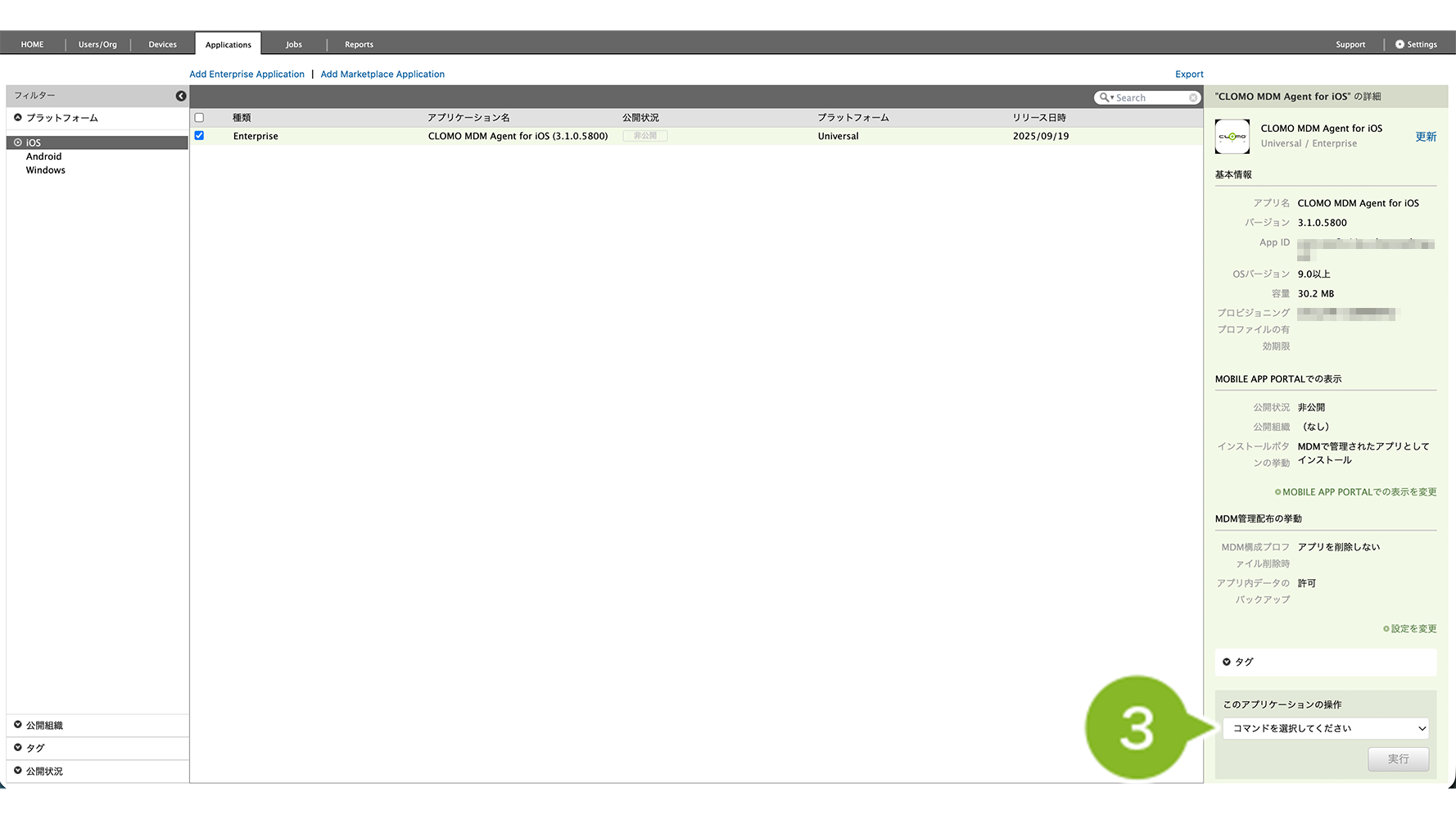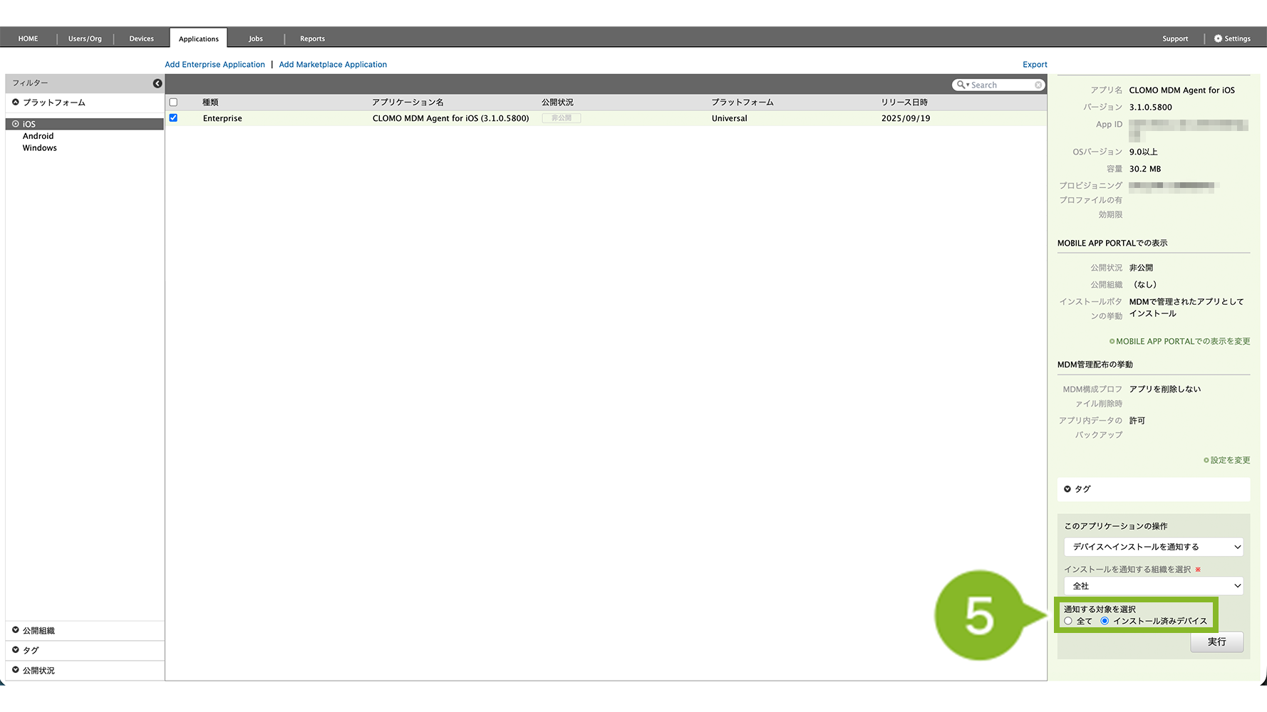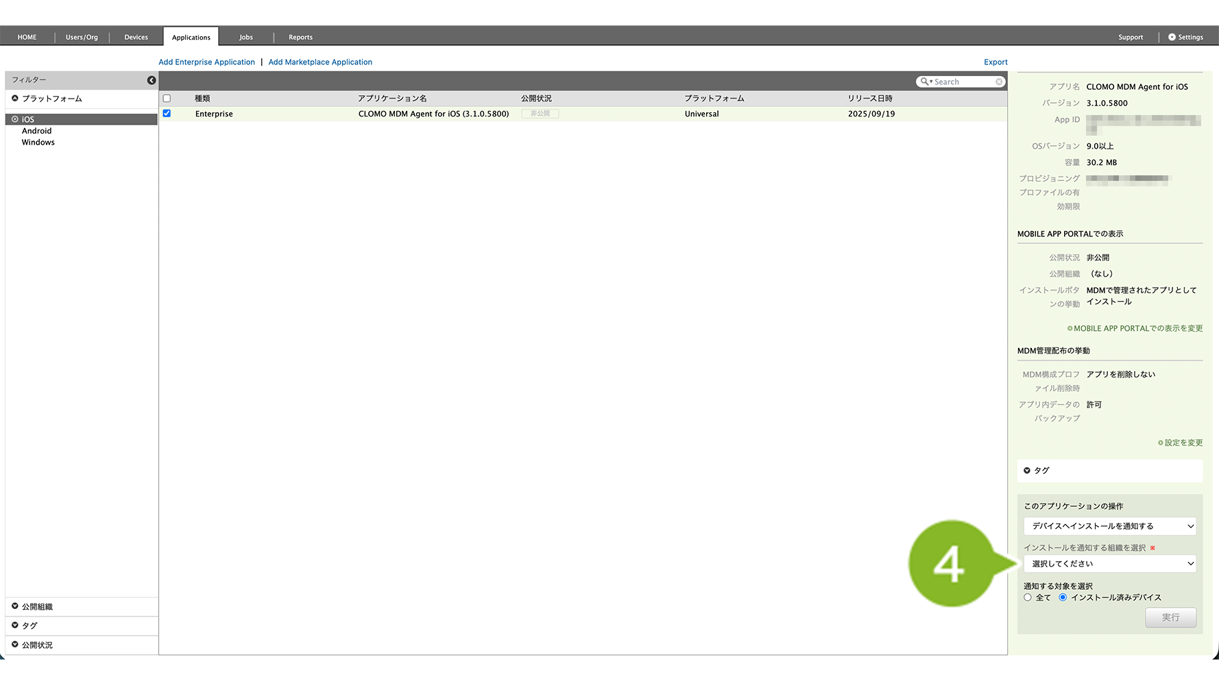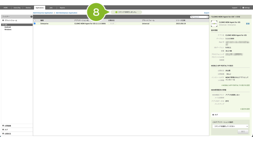 コマンドの仕組み・実行方法を参考に、「アプリケーションのインストールを通知」コマンドを実行してください。