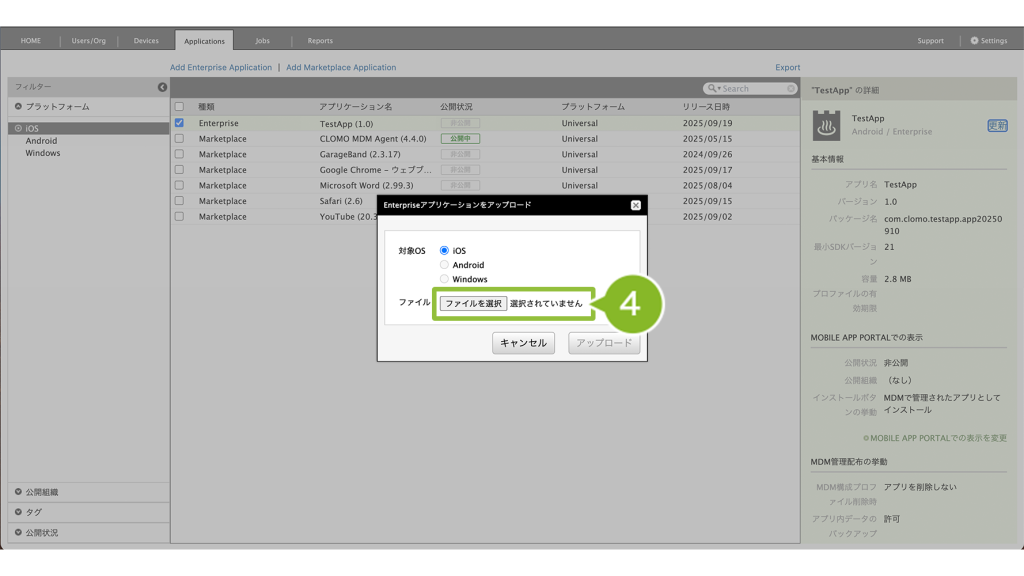 3. 「対象OS」は[iOS]のまま、[ファイルを選択]をクリックして、ipa ファイルをアップロードします。