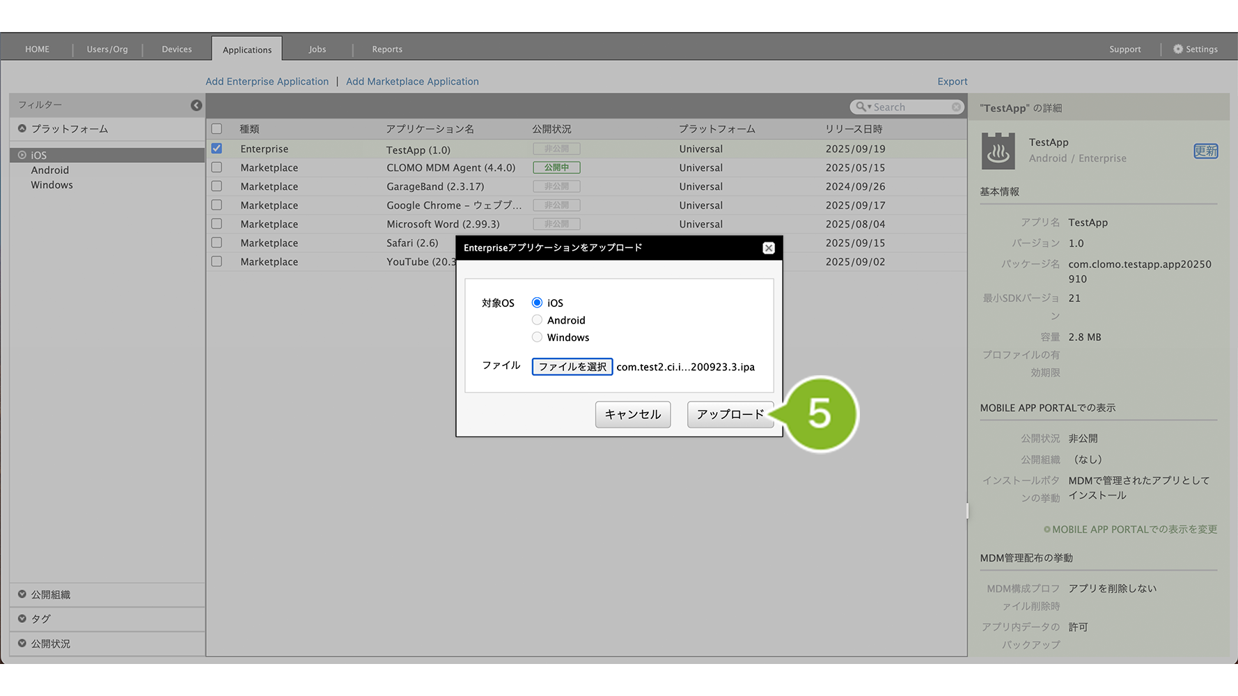 ※アップデート版アプリを登録するときは、旧バージョンと同じ設定を選択します。異なる場合、上書きでのインストール(アップデート)がおこなえないときがあります。