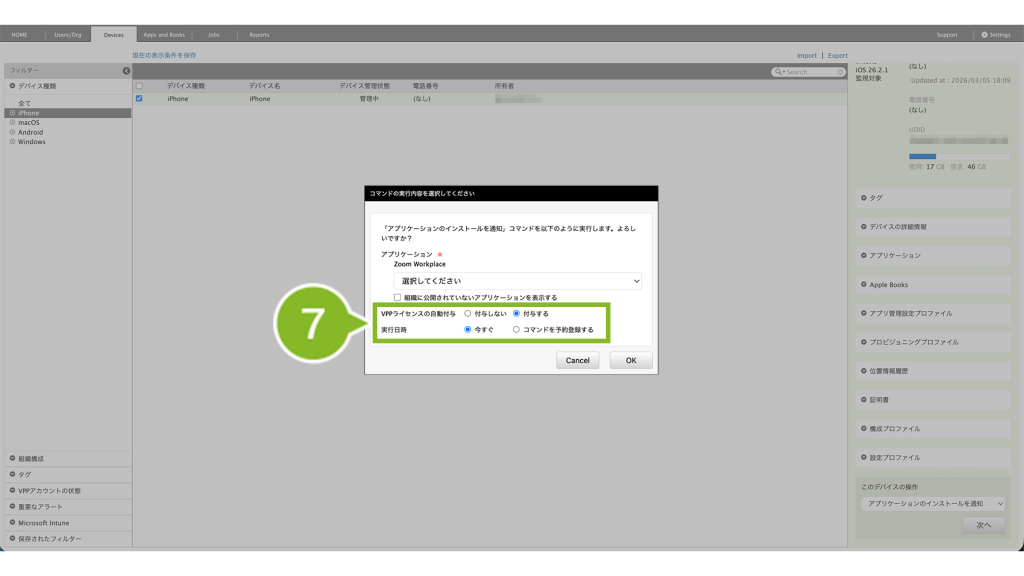 | VPPライセンスの自動付与 | VPP アプリを配布するためにデバイスに付与が必要な「VPP ライセンス」の付与を同時におこなえます。「付与する」を選択します。 |