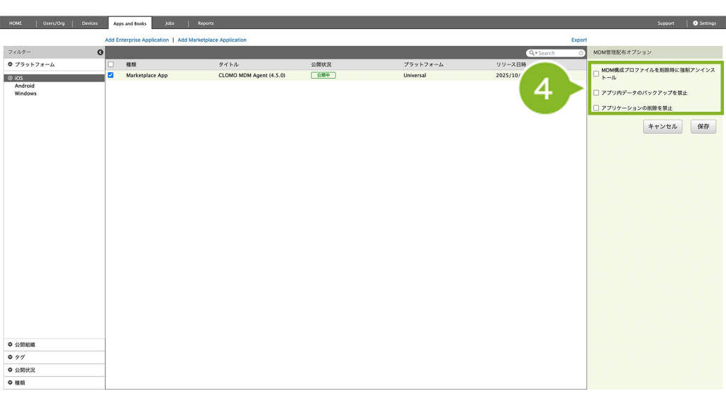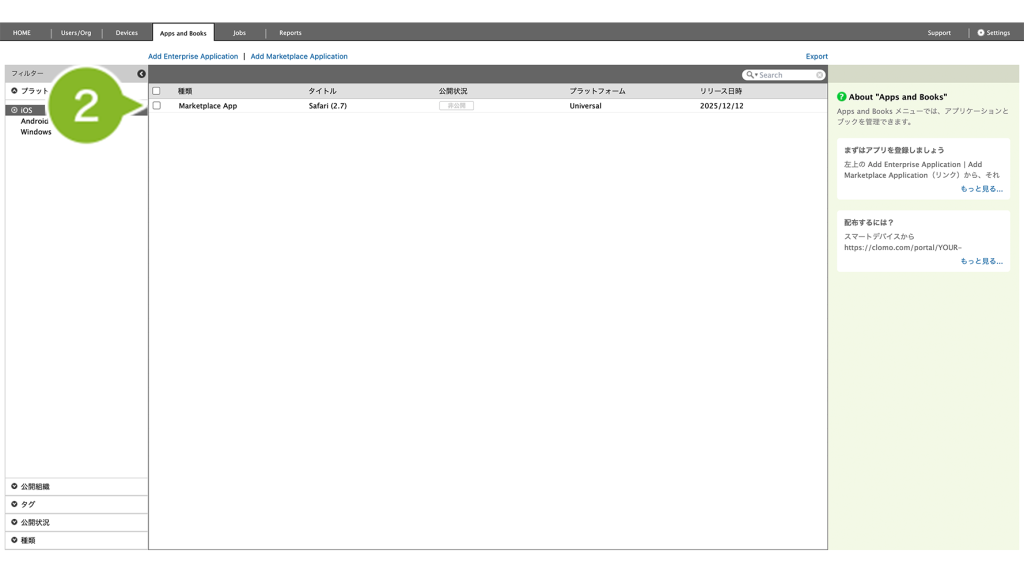 CLOMO で配布したいアプリケーションは、まず Apps and Books 画面に登録する必要があります。
