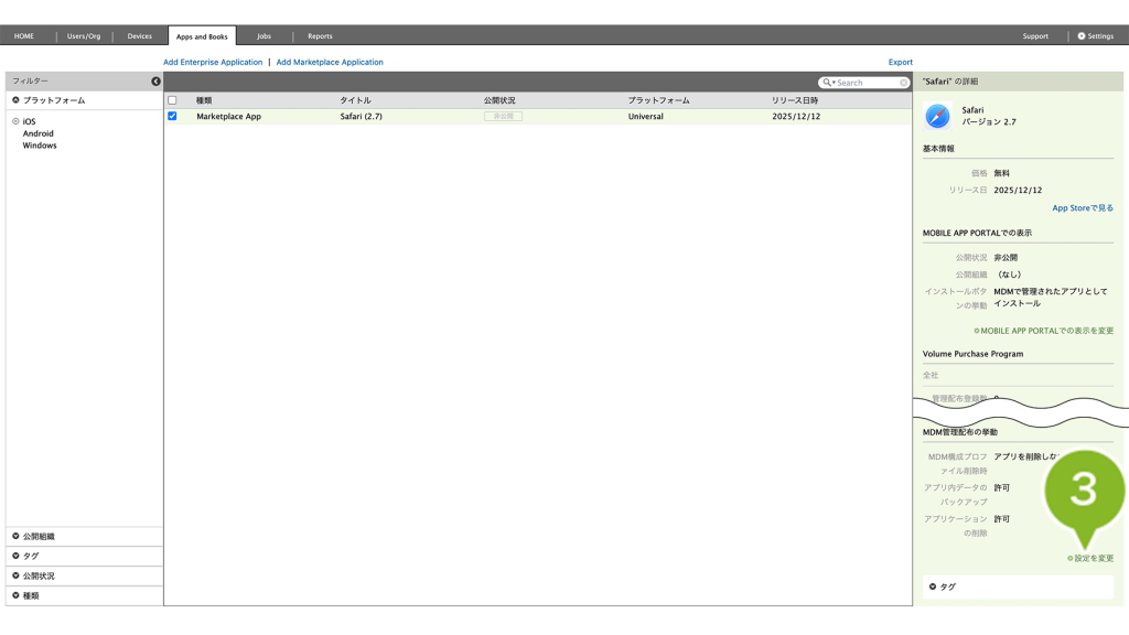 本設定を変更しても、すでにデバイスにインストールされているアプリケーションには影響がありません。