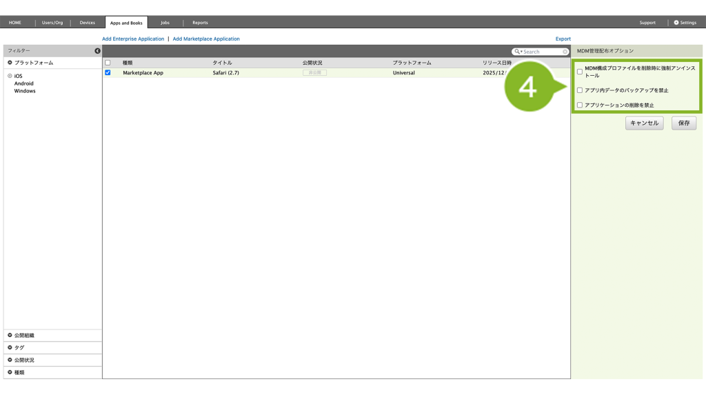 | アプリケーションの削除を禁止 | チェックを入れると、利用者によるアプリケーションの削除を制限できます。 |