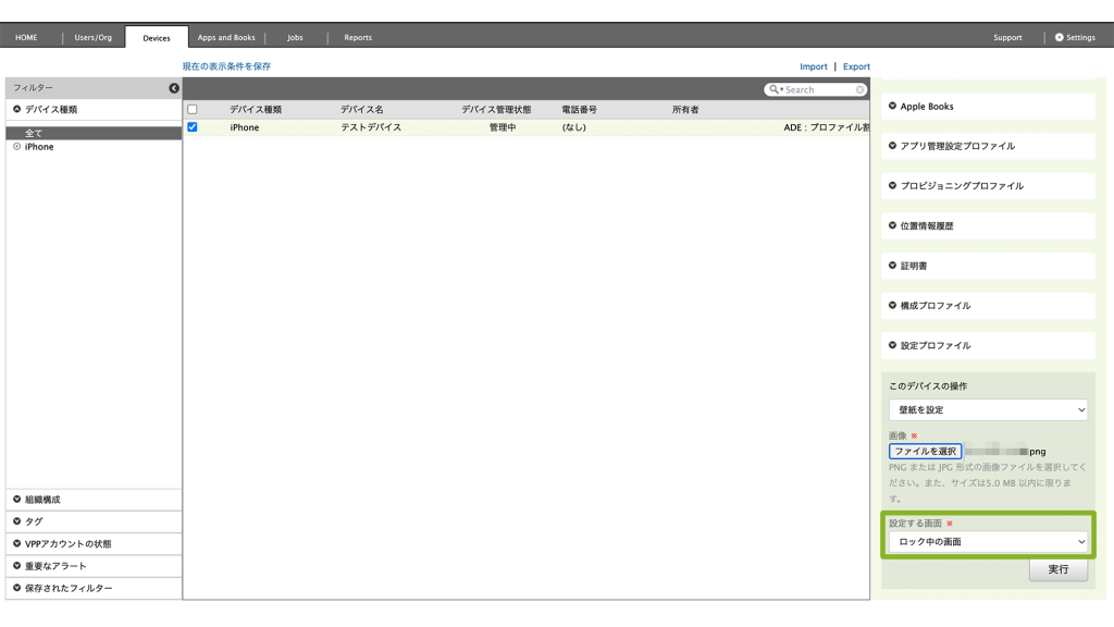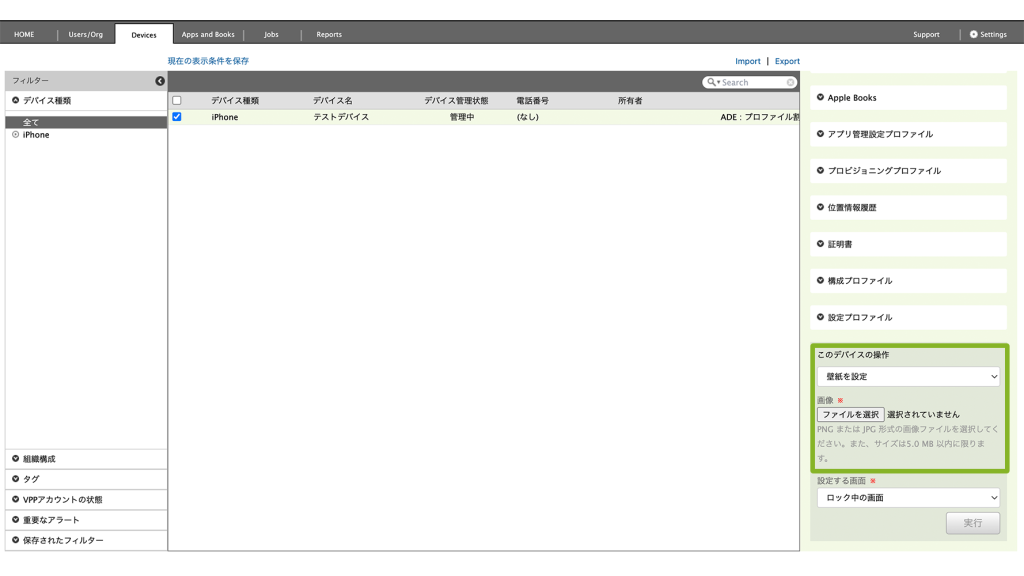 Devices 画面から対象のデバイスを選択後、[壁紙を設定]コマンドを実行することで、管理者が指定した画像をデバイスのロック画面やホーム画面に設定できます。