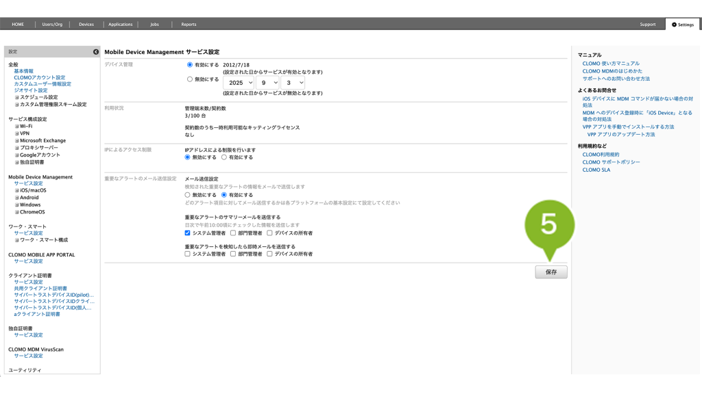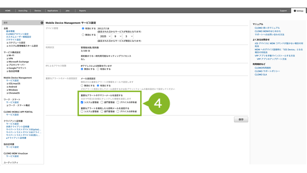 2:デバイス状態に応じたアラートのメール送信設定をおこなう(OS 別で設定が必要)