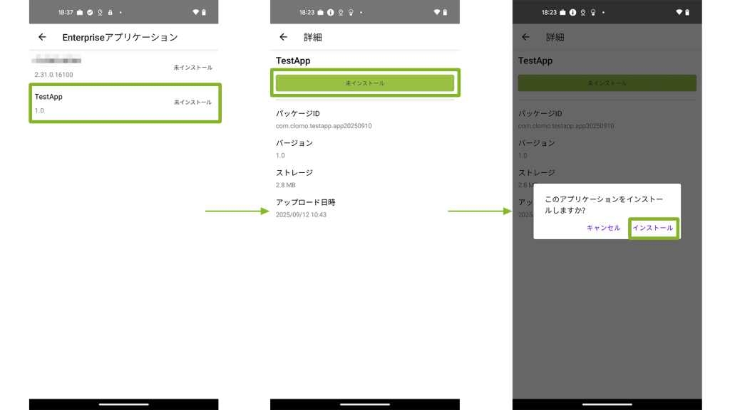 インストールする際は、対象のアプリケーションを選択し、表示される[未インストール]をタップして[インストール]を選択します。これにより、アプリケーションがデバイスにインストールされます。