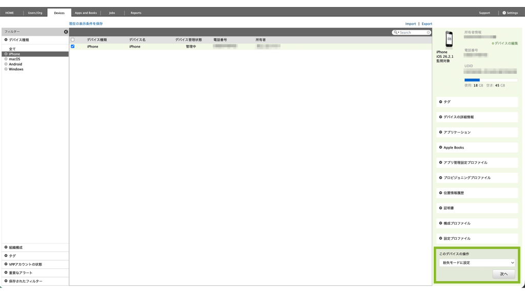 そのため、MDM 構成プロファイルが削除されたデバイスや、事前登録デバイスを含めた形で複数のデバイスを選択した場合には「デバイスを削除」のコマンドのみ表示されます。
