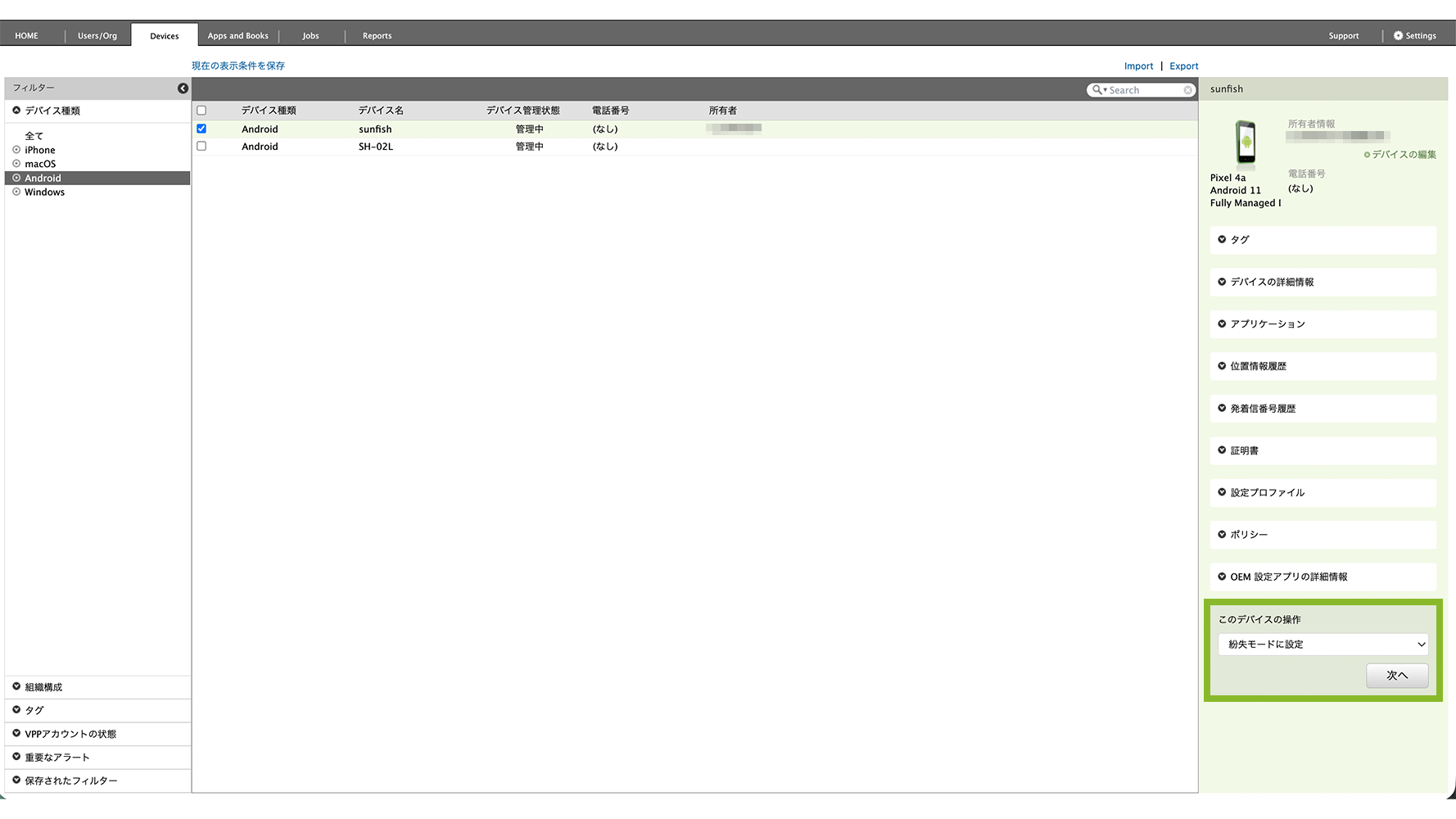 その要因となっている MDM 構成プロファイルが削除されたデバイスや、事前登録デバイスの選択を除外することで、他のコマンドも含めて表示されます。