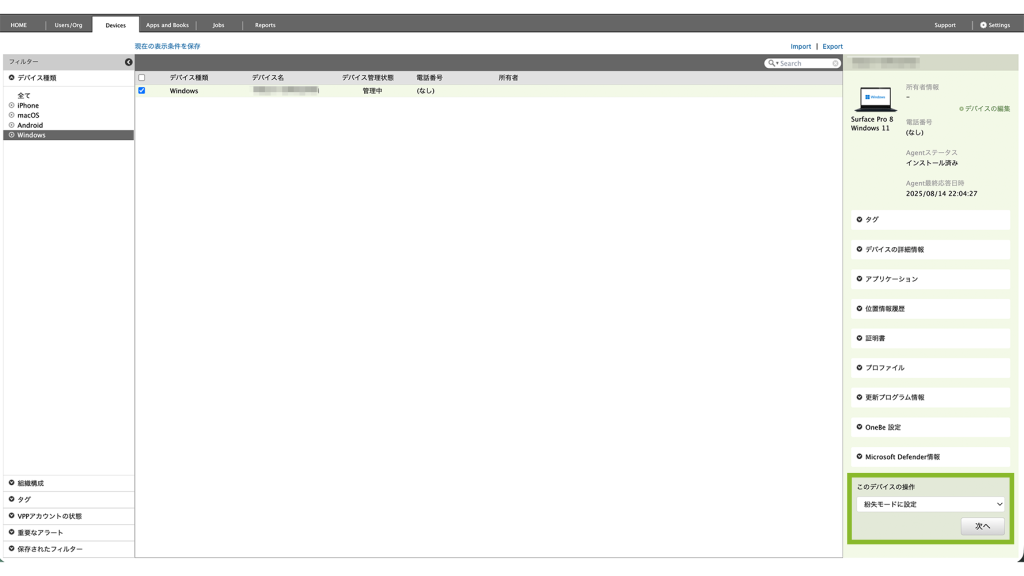 1. Devices 画面から紛失モードにしたいデバイスを選択後、[紛失モードに設定]を選択して[次へ]をクリックします。
