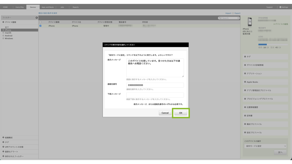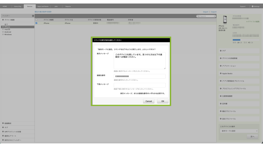 | 表示メッセージ | 紛失モード設定中に、画面に表示するメッセージを入力します。初期表示されているメッセージを削除し、空欄でコマンドを実行した場合、iOS 9 以下のデバイスでは「持ち主に連絡」と表示され、iOS 10 以上のデバイスではメッセージは表示されません。 |