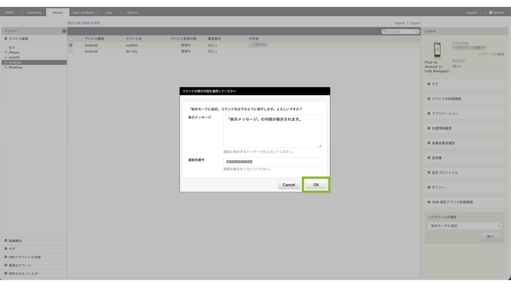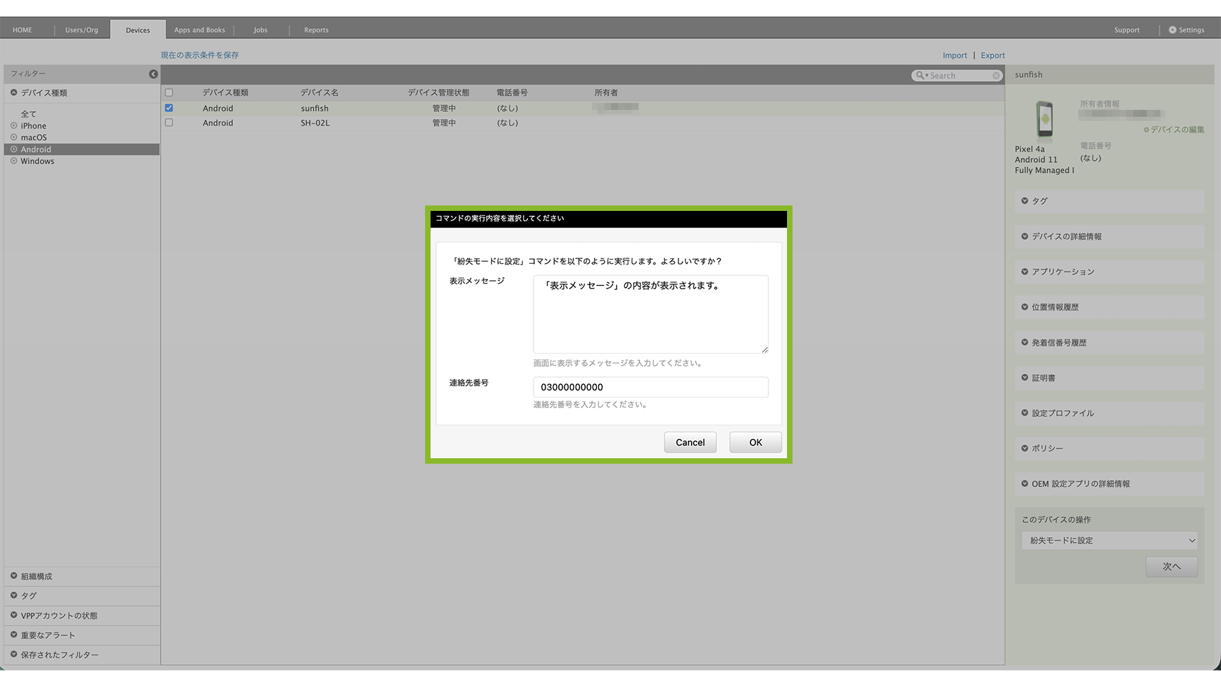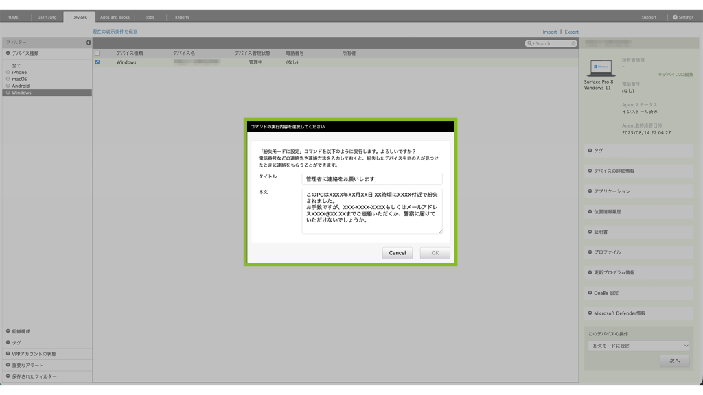 「紛失モードに設定」コマンドを使用すると、デバイスを遠隔でロックして、第三者による操作を防ぐことができます。