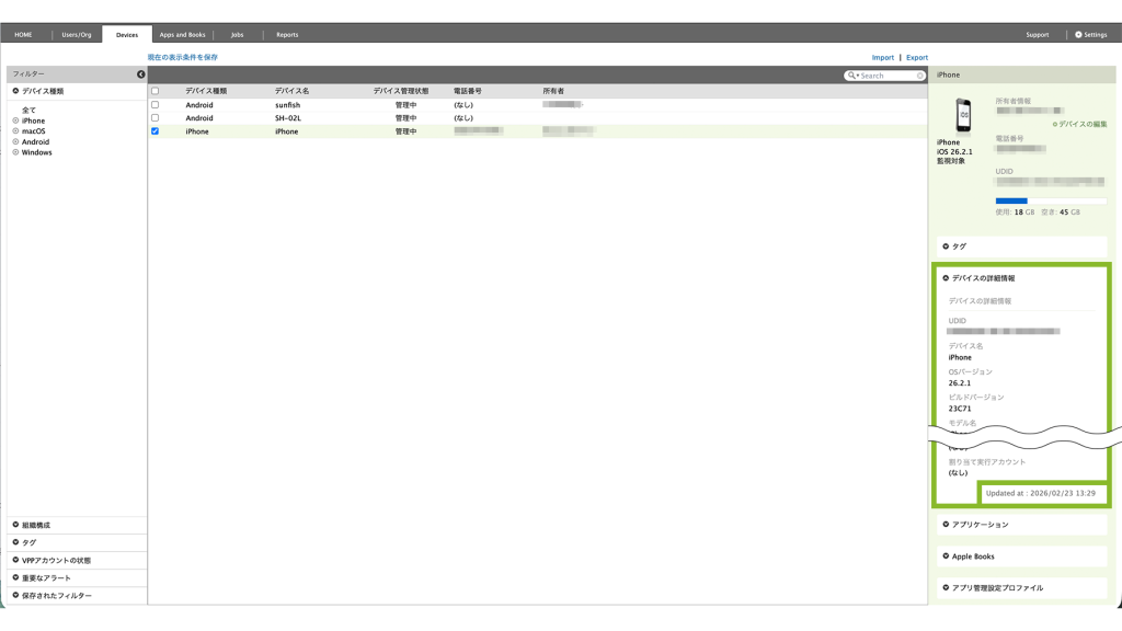 ※ ADE デバイスの再登録後、「デバイスの詳細情報」に「ADE デバイス情報」が表示されていない場合は、「ADE デバイスの一覧を更新する」を実施してください。手順はこちらをご確認ください。