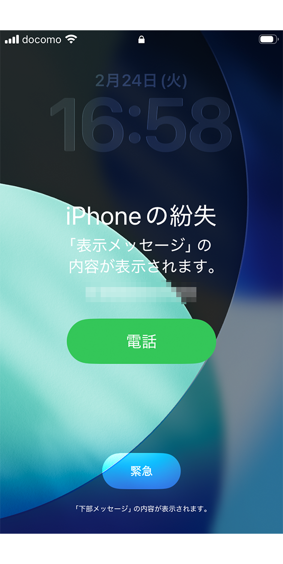 | 下部メッセージ | 紛失モード設定中に、画面下部に表示するメッセージを入力します。 |
