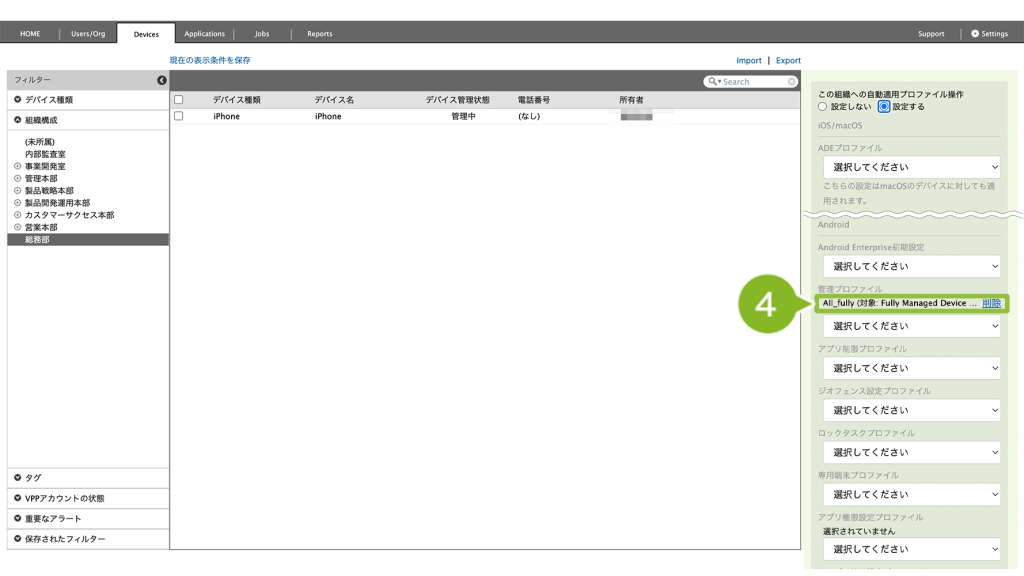 選択した組織の Android デバイスに自動適用設定をしたい場合