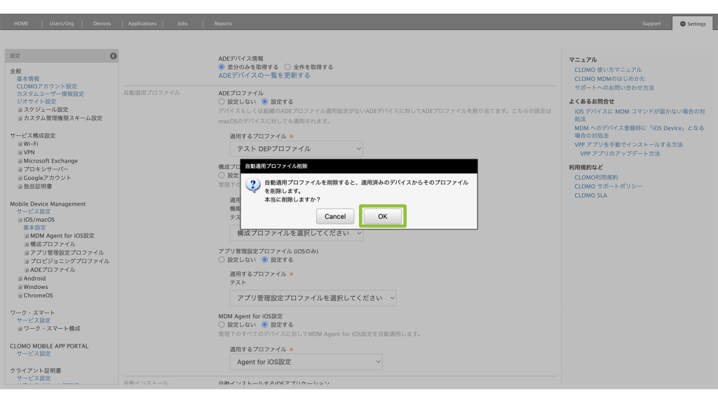 自動適用プロファイル(全社向け・組織向け)でプロファイルの設定、インストールが完了した後に、CLOMO PANEL 上で「設定する」→「設定しない」に変更すると、インストールされたプロファイルを削除するよう、自動的にプロファイルのアンインストールコマンドが実行されます。