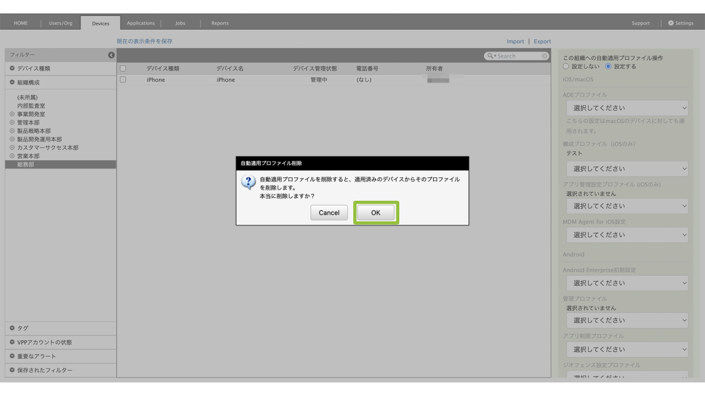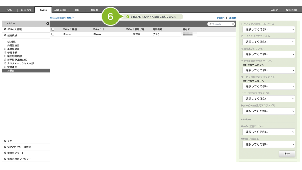 プロファイルの自動適用を実行後、7日以内にデバイスから応答がなかった場合、自動適用は実施されません。再度、自動適用をおこなってください。