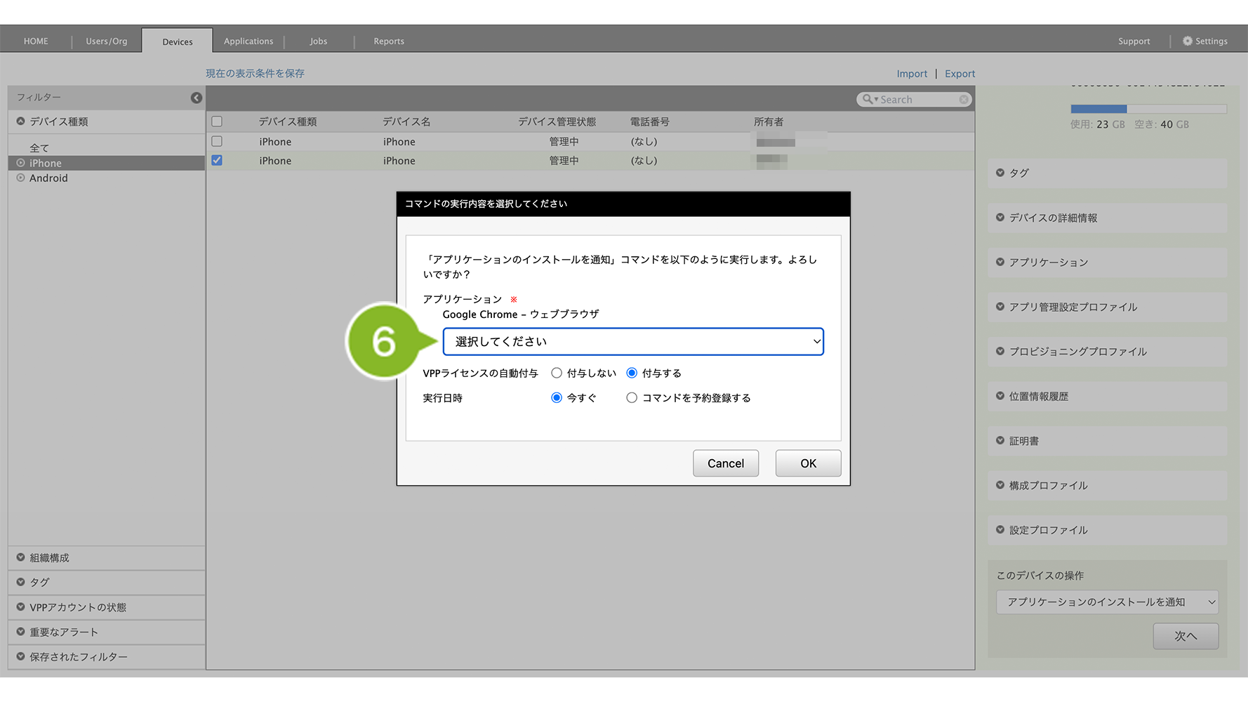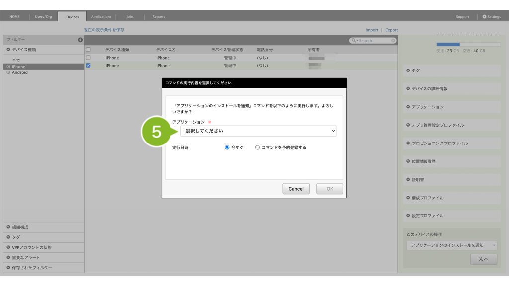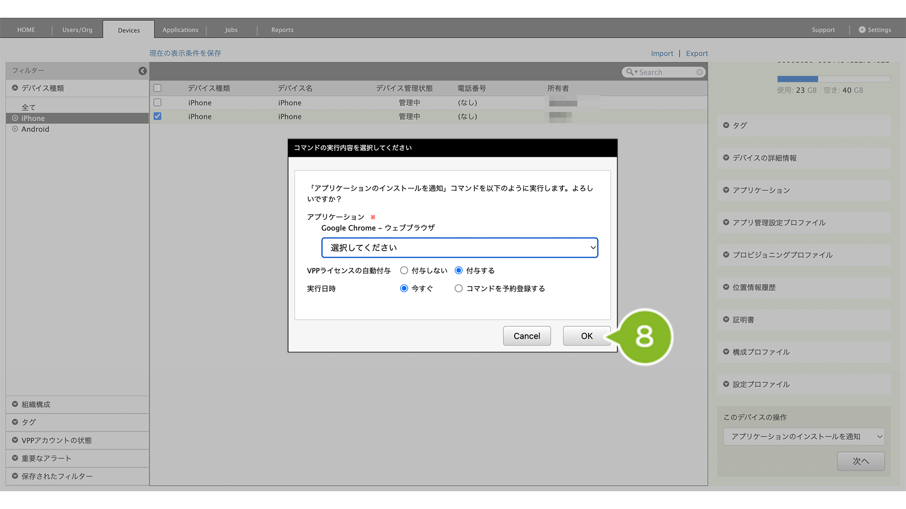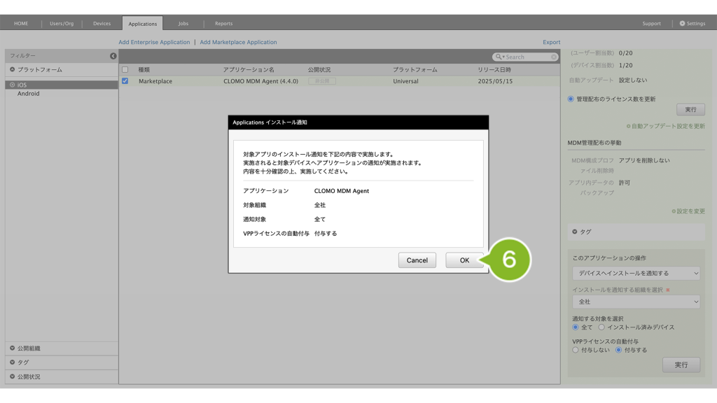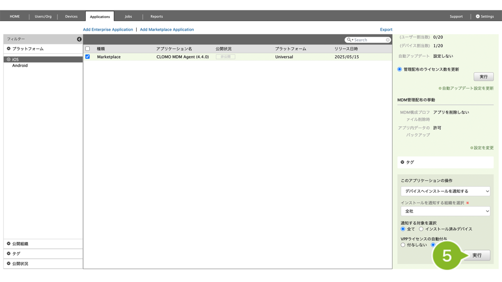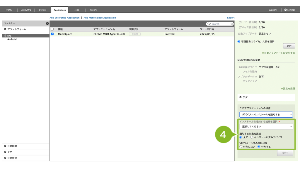 - 選択した組織や全 iOS デバイスに対してアプリケーションをインストールする場合