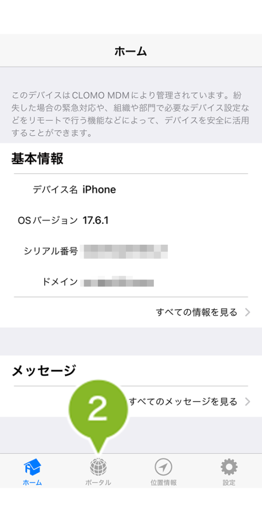 ※ 別の画面が表示される場合は、デバイスに適用している MDM Agent for iOS 設定プロファイルの「ポータル設定」を「構成する」に設定している可能性があります。設定変更をご検討ください。