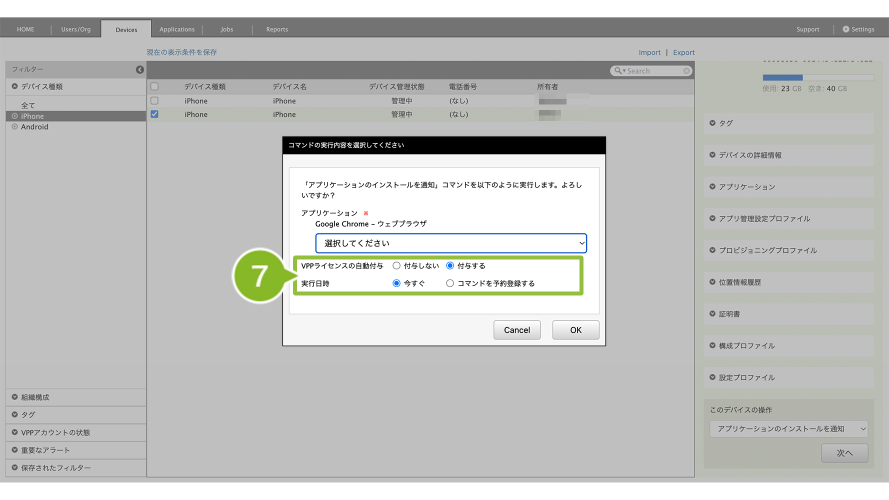 VPPライセンスの自動付与 | VPP アプリを配布するためにデバイスに付与が必要な「VPP ライセンス」の付与を同時におこなえます。「付与する」を選択します。 |